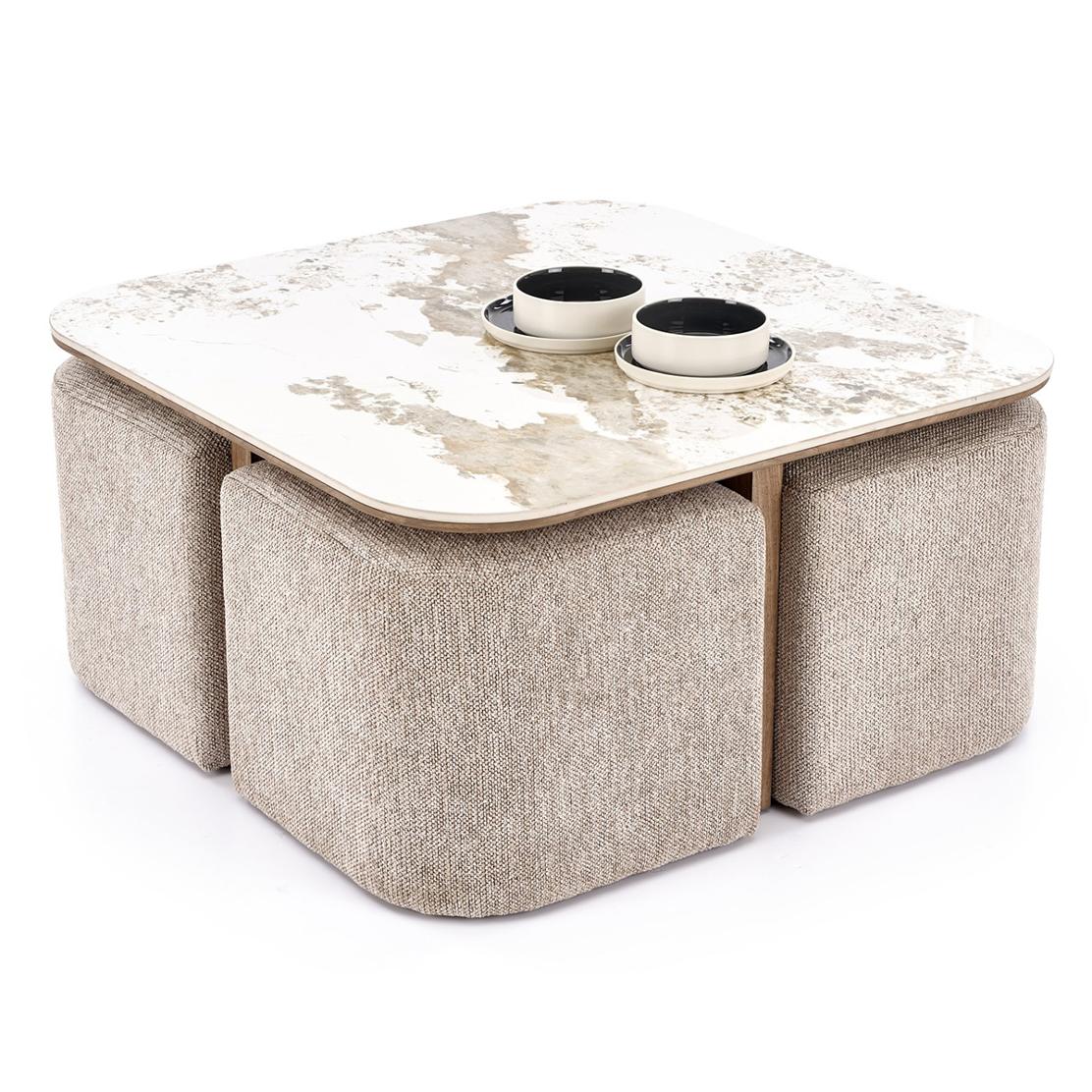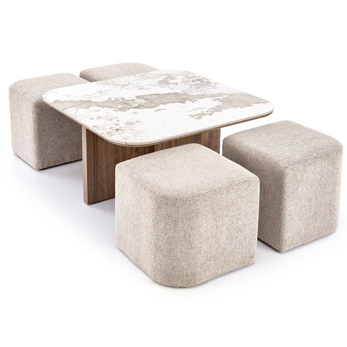 Преобразете дневната си с холна маса ARAKIS, комплект с четири дискретно прибиращи се пуфа. Това интелигентно решение оптимизира пространството, предлагайки допълнителни места за сядане, които елегантно изчезват, когато не са нужни. Идеална комбинация от стил и практичност.