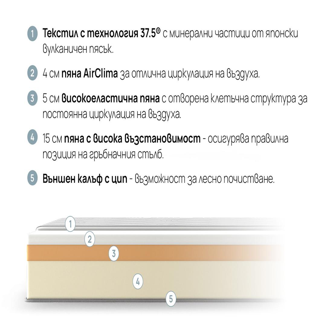 • Ядро: 3-слойно от пяна AirClima (4 см), високоеластична пяна (5 см) и пяна с висока възстановимост (15 см)