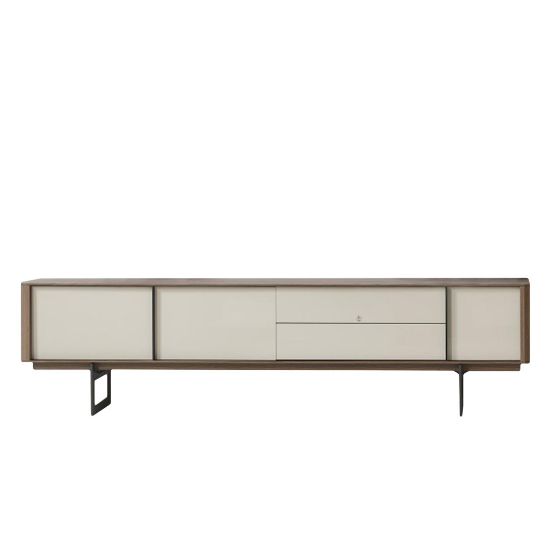 ТВ Модулът, който предлагаме, е изработен от висококачествен МДФ, който осигурява здравина и издръжливост. Модулът разполага с механизми с плавно затваряне, които предпазват вратичките и чекмеджетата от удари и шум. Съчетанието на дървесен фурнир и цвят крем придава на модула топъл и уютен вид, който се вписва в различни интериори. Модулът е допълнен с метални крака и красиви дръжки в черен цвят, които му придават модерен и стилен акцент. ТВ Модулът е идеален за вашата дневна или спалня, където можете да се наслаждавате на любимите си филми и предавания.