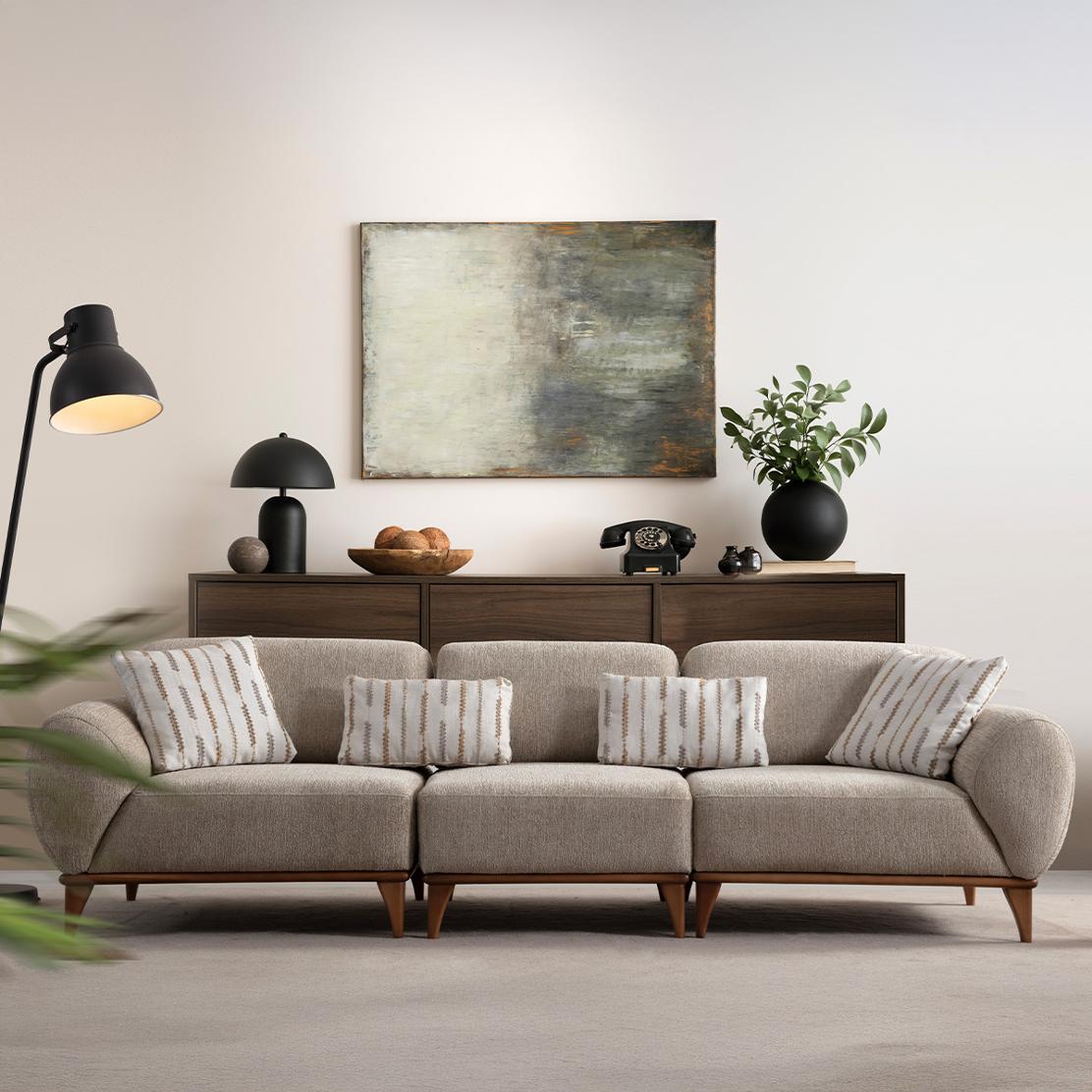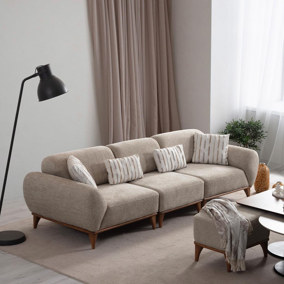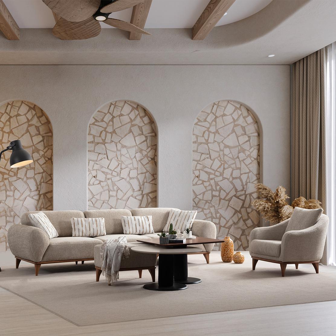 Barcelona впечатлява с плавно заоблените подлакътници, балансираните пропорции и леката линия на дървените крака. Този модел е идеален за по-големи дневни пространства, като осигурява комфорт при четене, семейно кино или събирания с приятели.