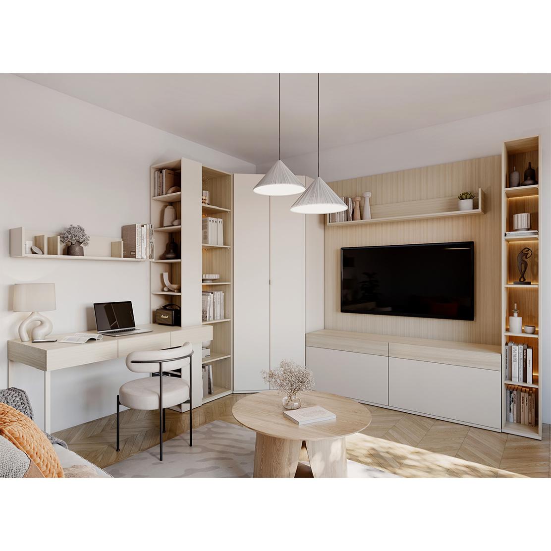 • Отворени рафтове за лесен достъп и излагане на декорации или книги.