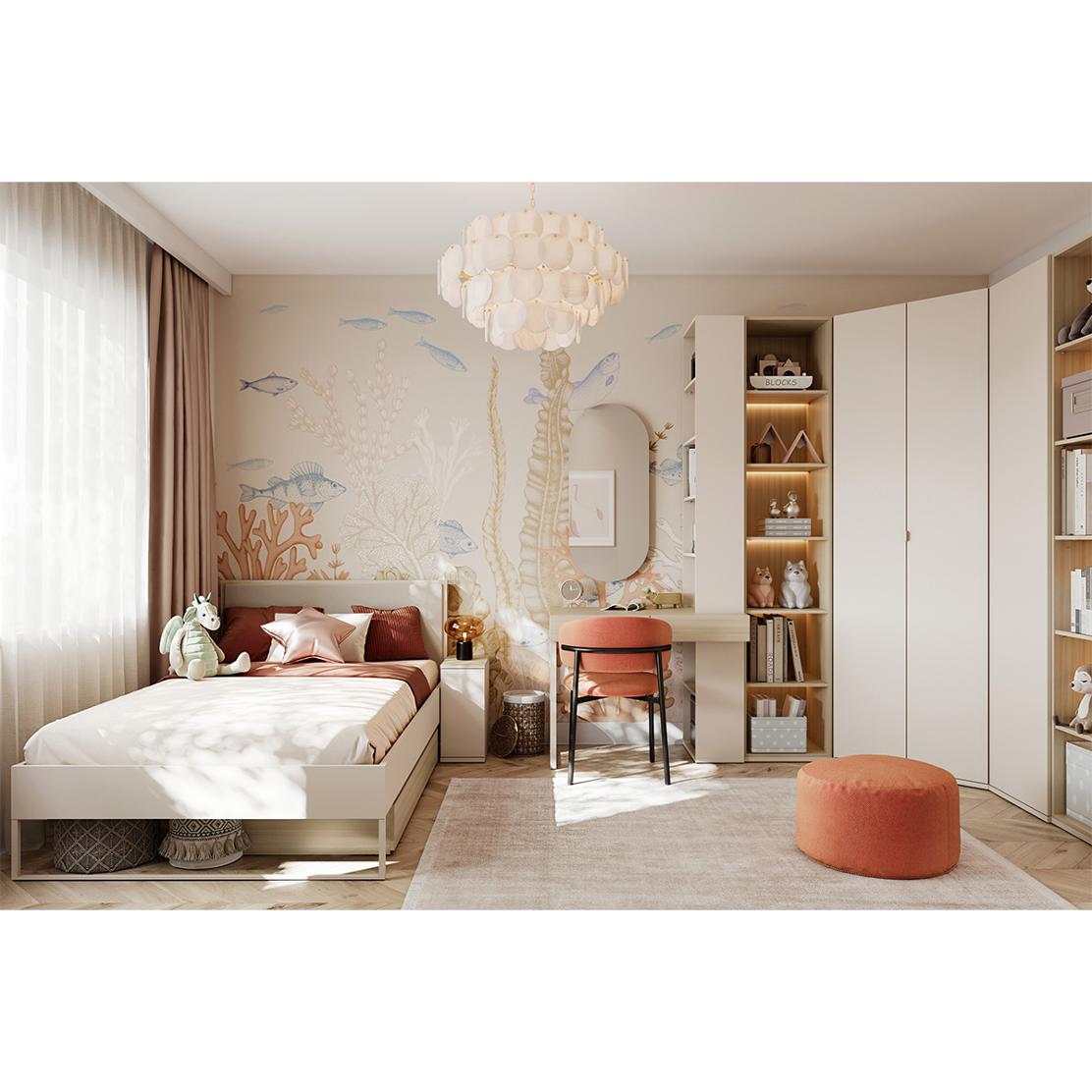 • Цвят: Пустинен пясък (рамка), дъб бариста (чекмеджета), светлобежова тапицерия