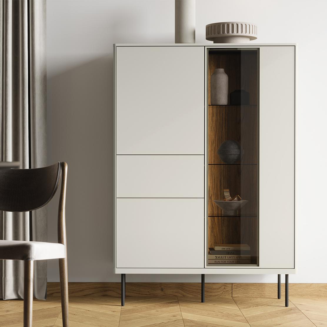 Цветовата комбинация от кашмир и тъмен дъб внася усещане за топлина, хармония и стил, което прави витрината чудесен акцент за всяка дневна, трапезария или офис.