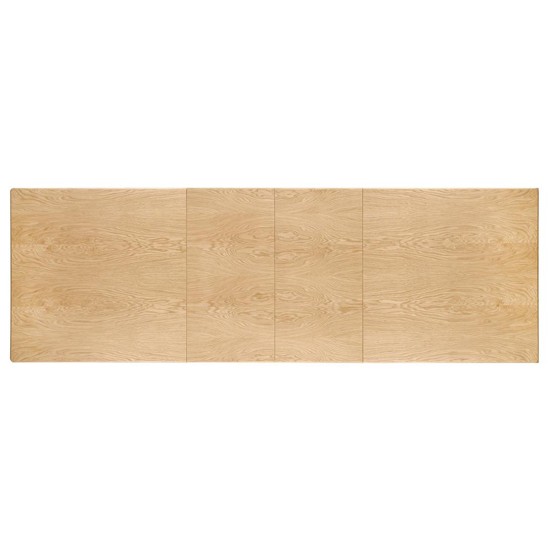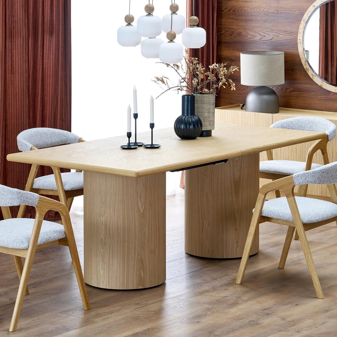 Изработена от естествен фурнир в цвят светъл дъб, масата излъчва топлина и уют, които лесно се вписват както в модерни, така и в по-класически интериори. Масивната ѝ визия е балансирана от плавните форми на основата, придаващи усещане за стабилност и елегантност.