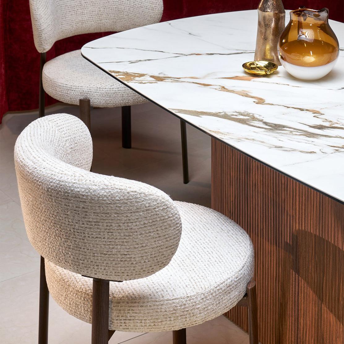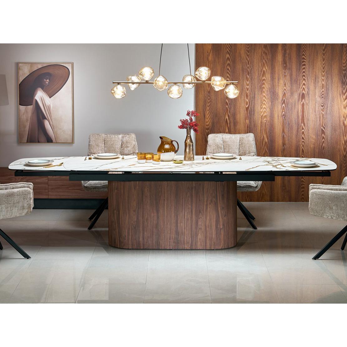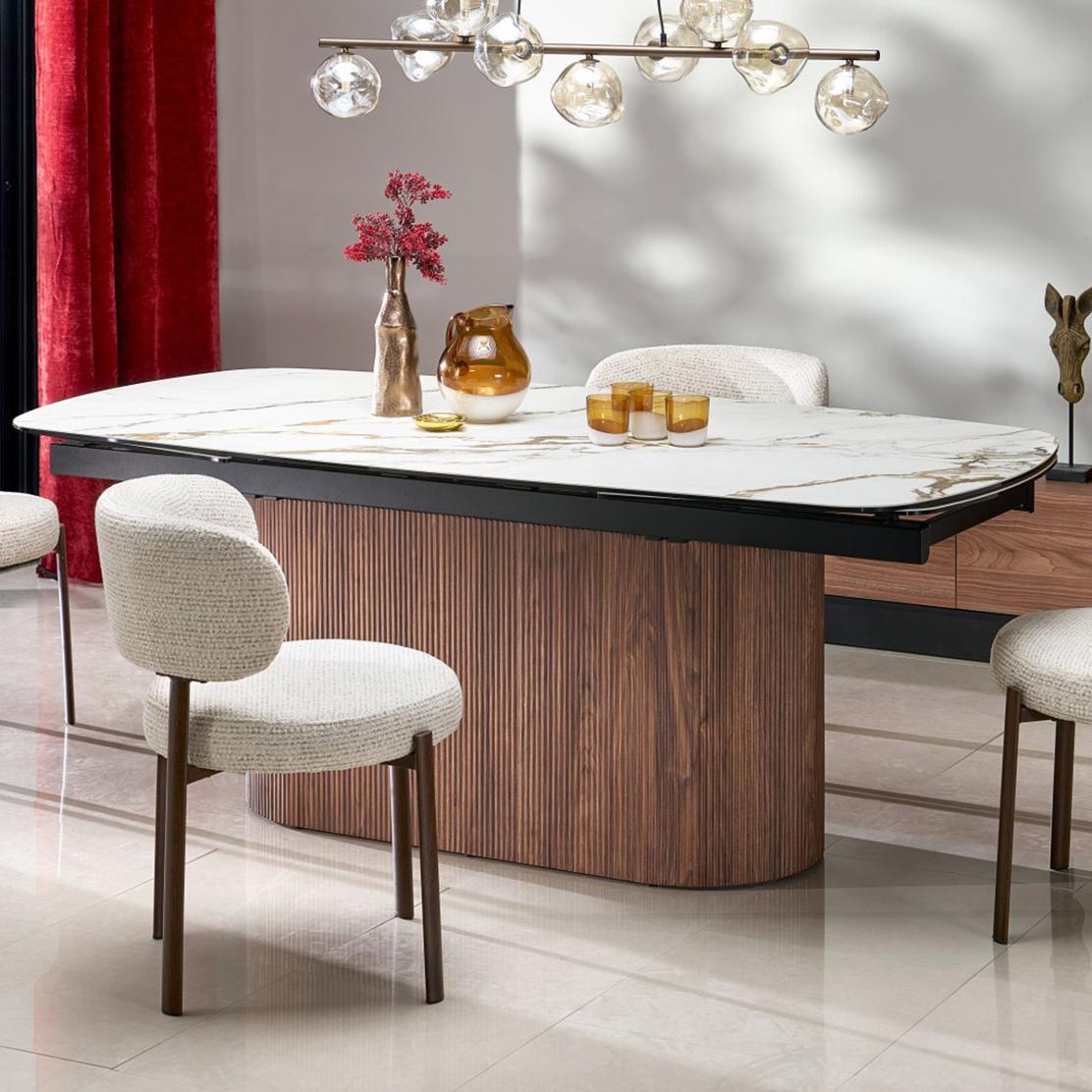 Плотът от керамика в бежов мраморен цвят създава усещане за елегантност и лекота, като същевременно предлага висока устойчивост на надраскване, топлина и петна. Основата от фурнирован MDF в топъл орехов нюанс добавя естествен баланс и уют, превръщайки масата в стилен акцент, който лесно се вписва в различни интериорни концепции.