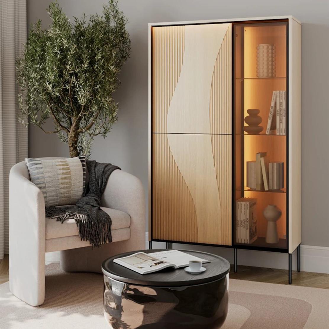 Изградете мечтания интериор с гъвкавите модули, включващи витрина с LED осветление и стилна холна маса. Черните метални крака добавят модерна нотка, а висококачественото ПДЧ гарантира здравина. Насладете се на персонализиран дизайн, отразяващ вашия вкус и нужди.