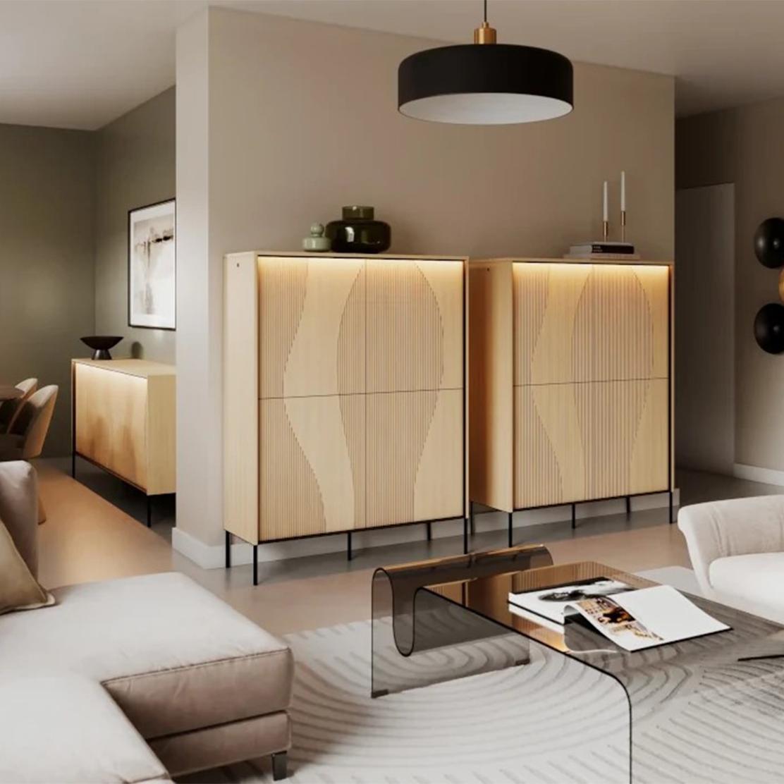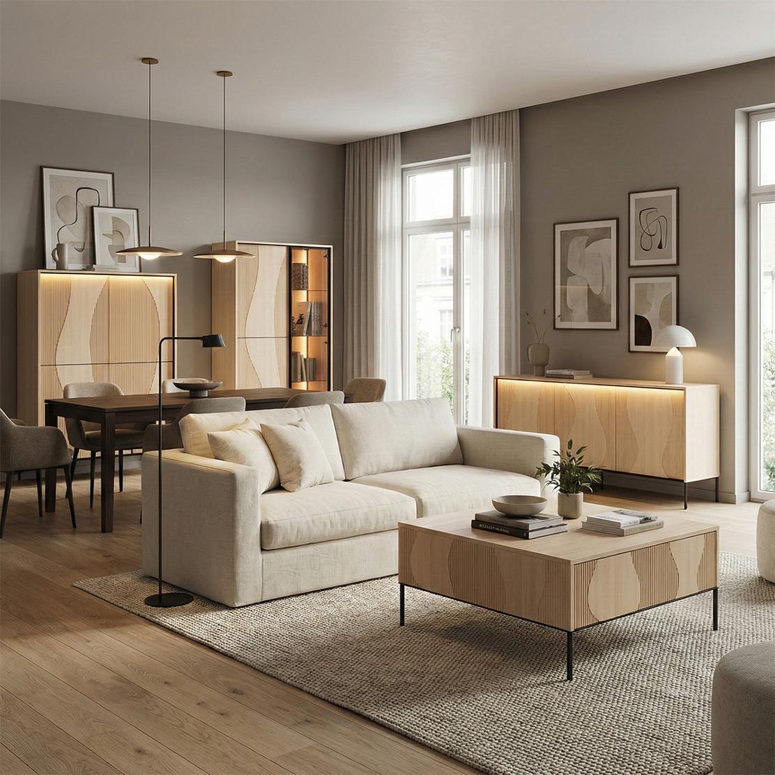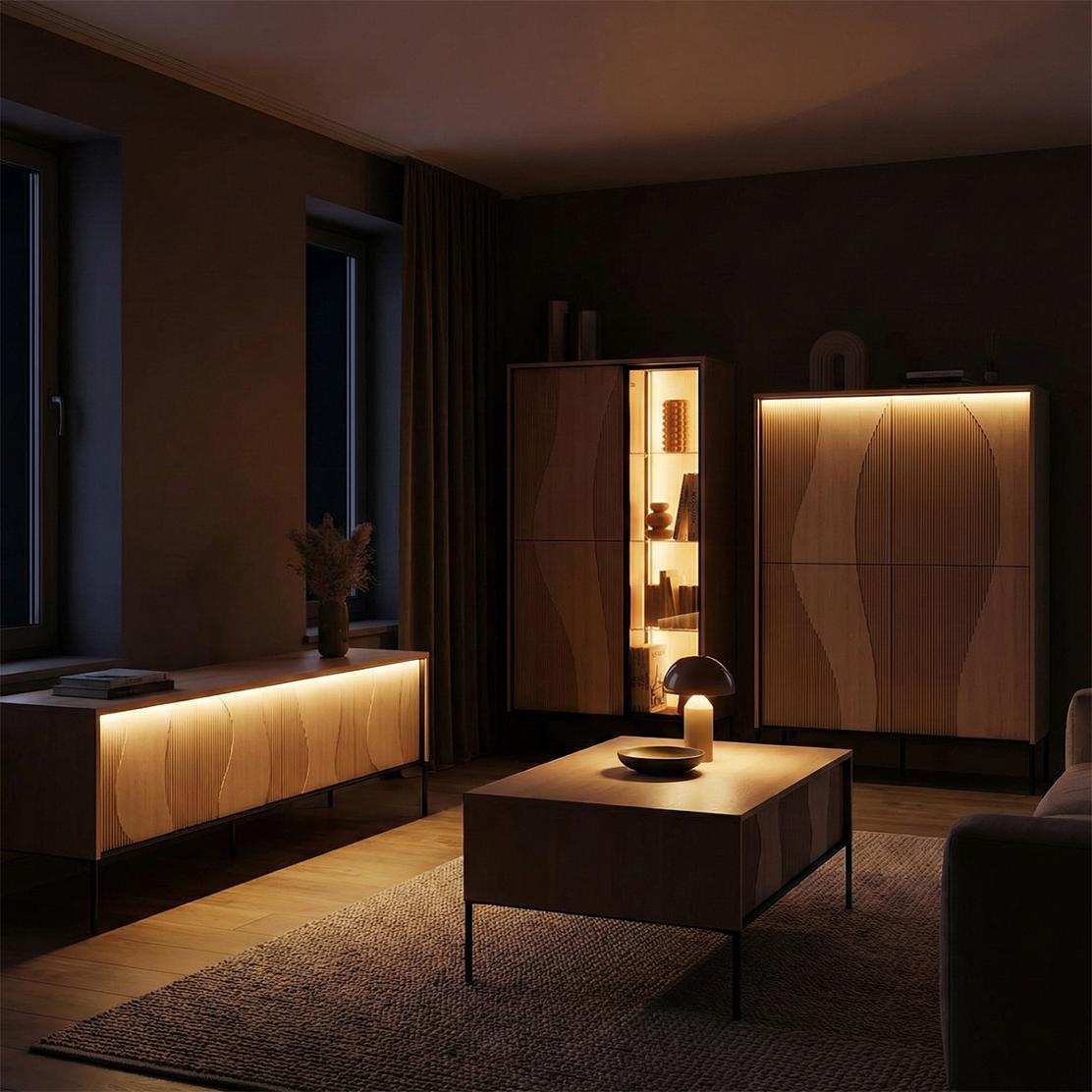 Модулна дневна FLOW: Елегантност, LED осветление и дъб виенченца за вашия стилен дом