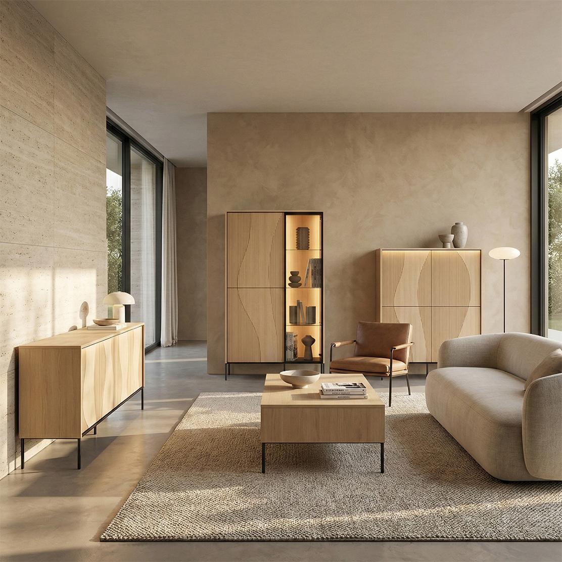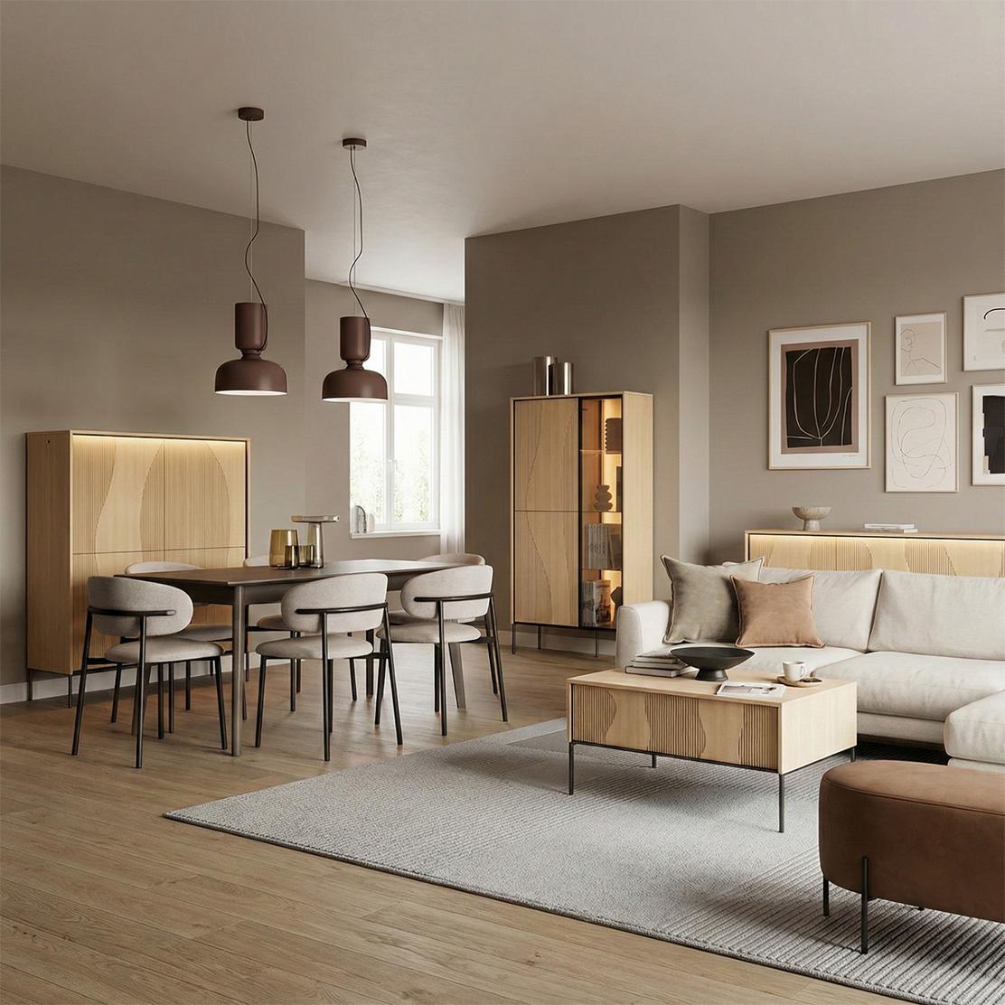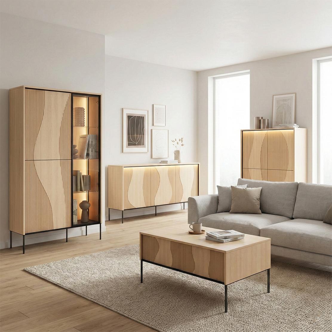 Модулна дневна FLOW: Елегантност, LED осветление и дъб виенченца за вашия стилен дом