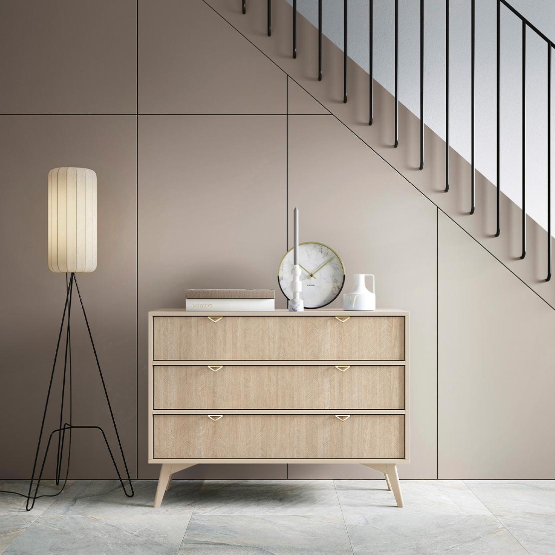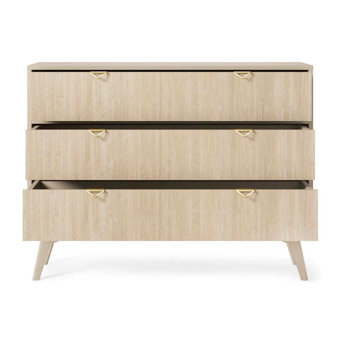 Със своите 3 просторни чекмеджета, този скрин предлага отлично решение за организация на дрехи, аксесоари, спално бельо или различни домашни принадлежности. Всеки детайл е внимателно подбран – от фино изработените златни дръжки до тънките повдигнати крака, които придават лекота и елегантна визия на модела.