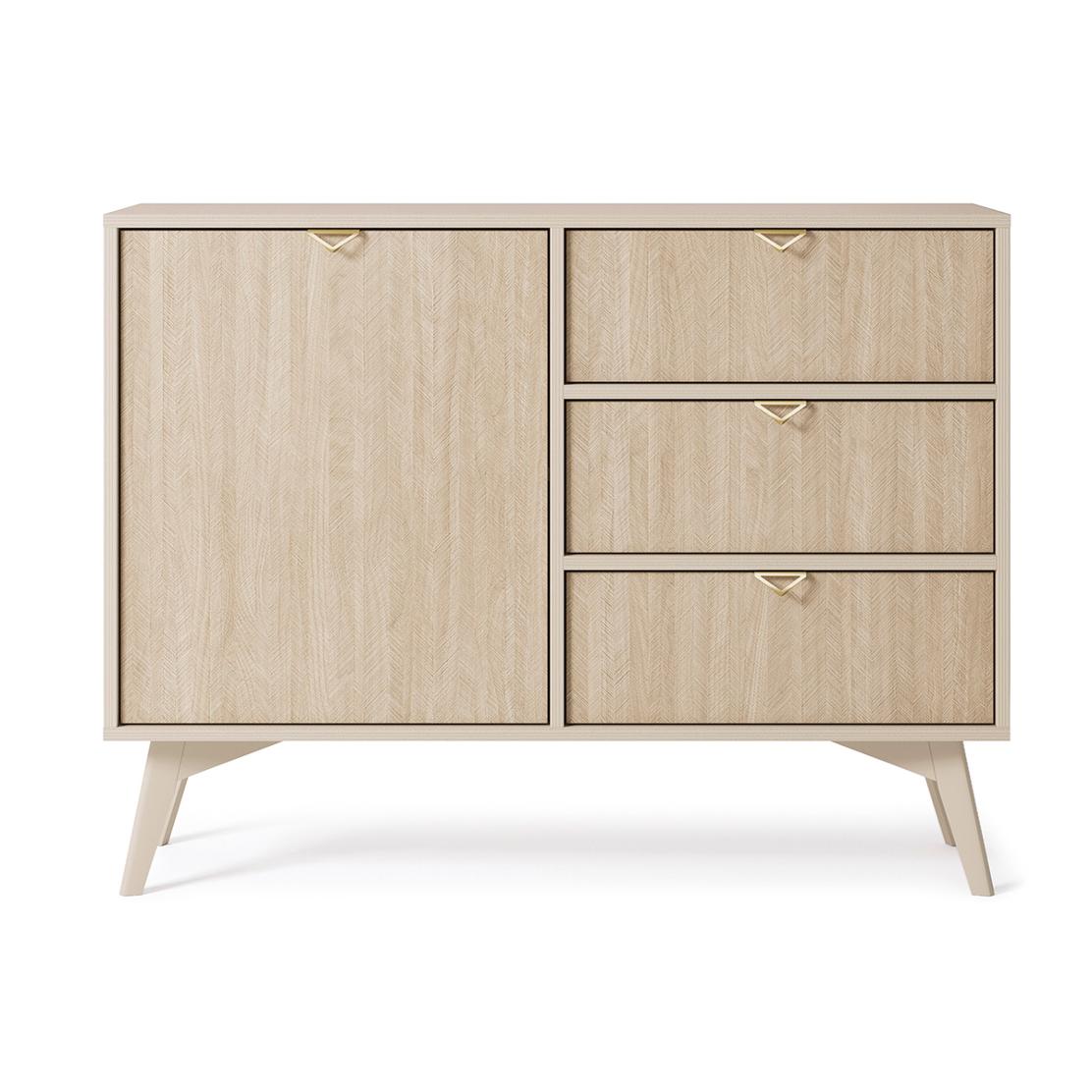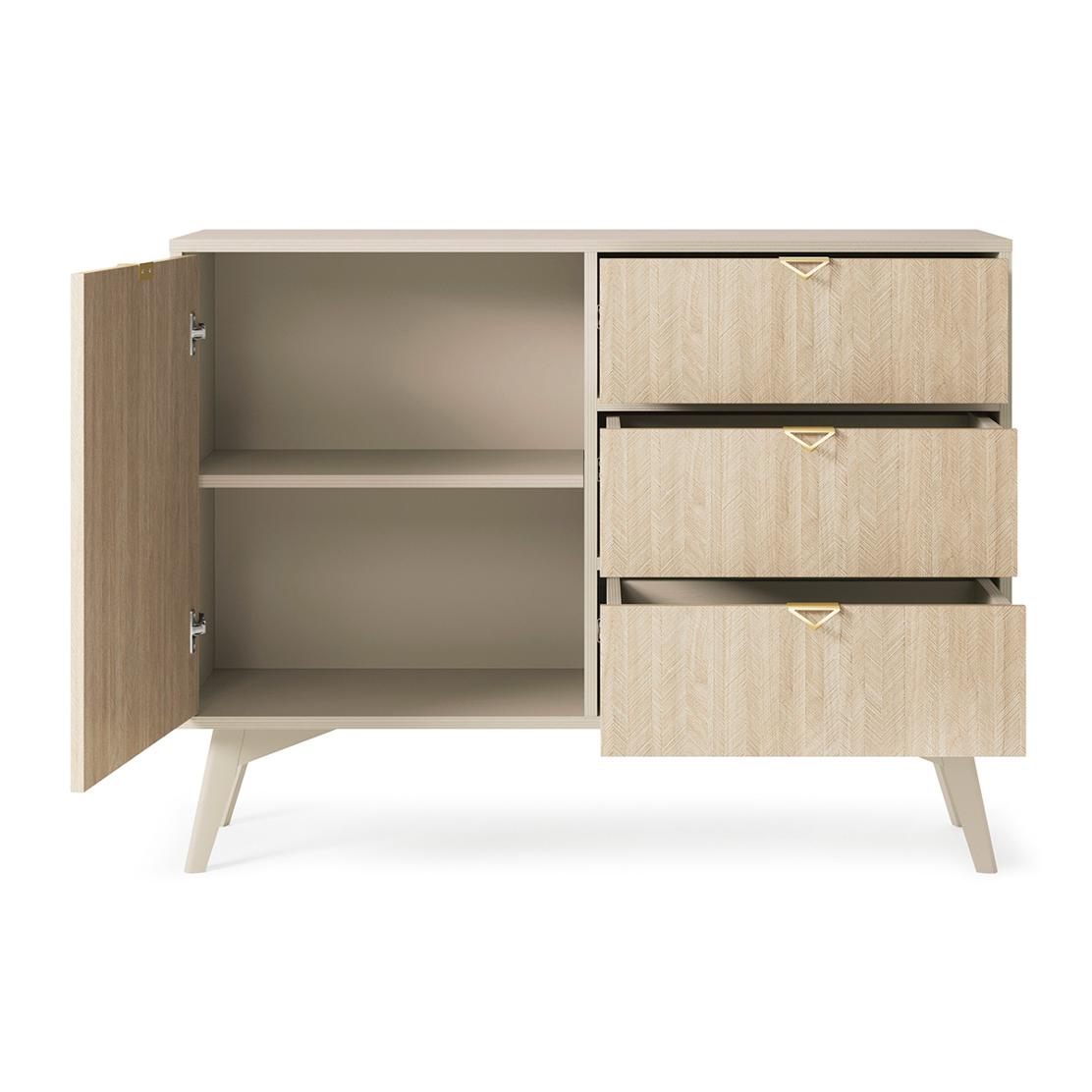FOREST скрин с чекмеджета е създаден за интериори, в които функционалността и естетиката вървят ръка за ръка. Нежният пясъчно бежов цвят в комбинация с дървесен десен тип рибена кост придава на модела топлина, естествена елегантност и усещане за премиум завършеност.
