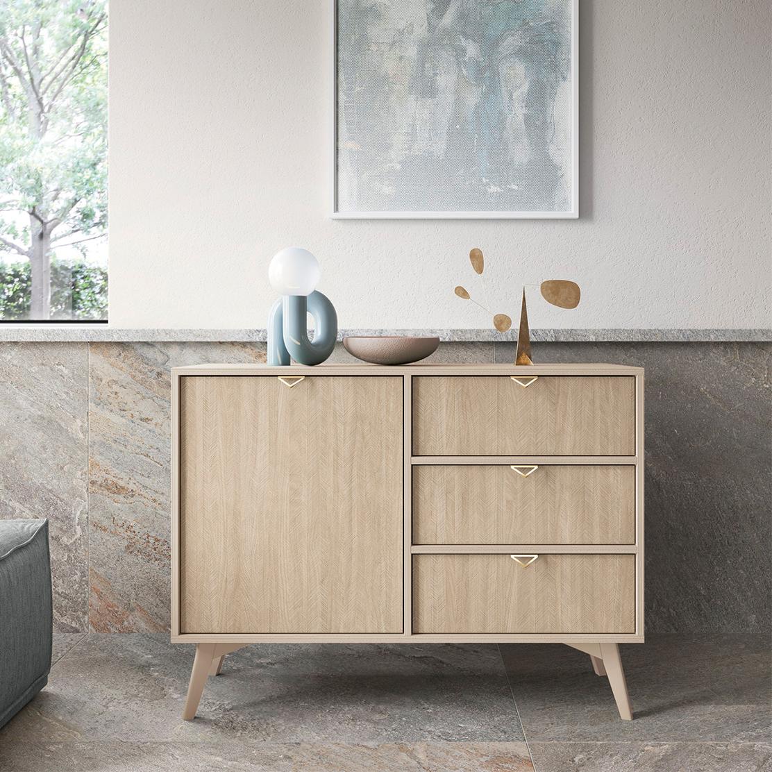 Фините златни дръжки добавят деликатен луксозен акцент, а тънките повдигнати крака придават визуална лекота и модерна визия. Те не само подчертават елегантния силует на скрина, но и улесняват почистването на пространството под него.