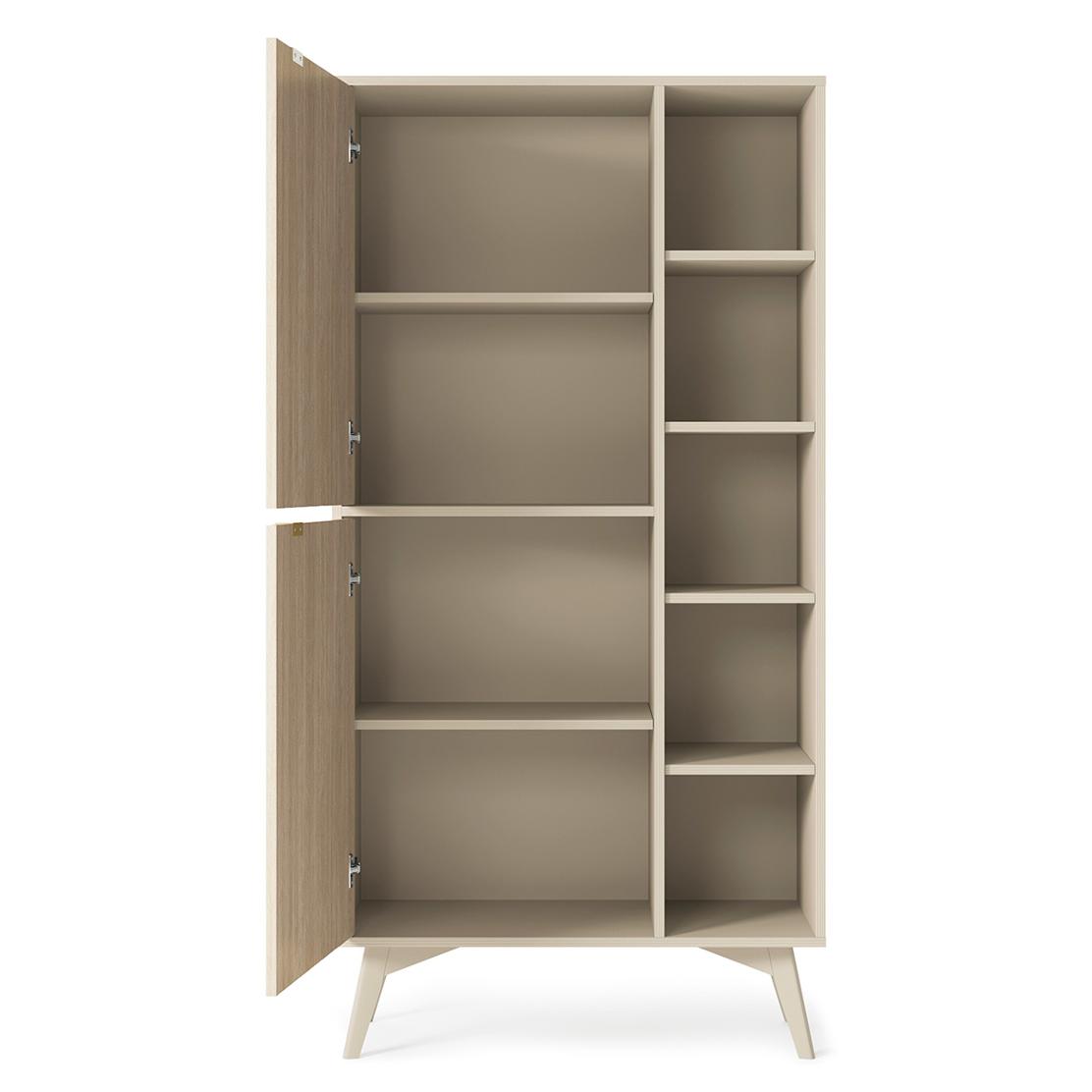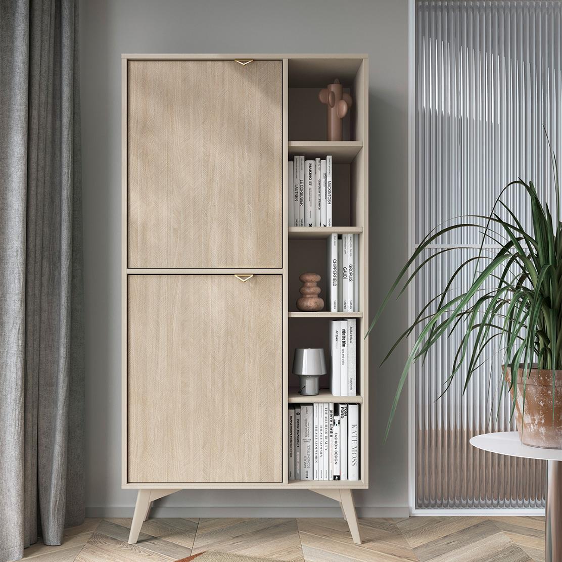 Този скрин предлага оптимизирано пространство с 5 отворени и 2 затворени отделения, съдържащи общо 4 рафта. Повдигнатите крачета гарантират лесно почистване под мебела, а стабилната конструкция осигурява дълготрайна употреба и надеждност.
