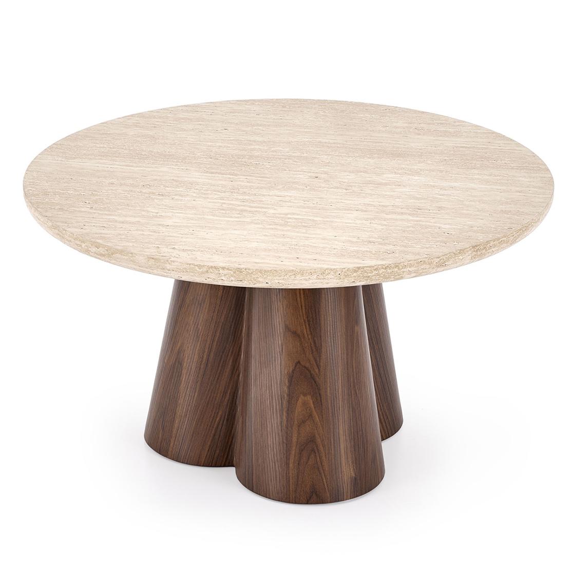 Травертиновият плот впечатлява с естествената си текстура и уникални нюанси, които придават индивидуалност на всяка маса. Основата от фурнирован MDF допълва визията с мекота и стабилност, създавайки балансиран силует, подходящ както за модерни, така и за по-естествени интериорни стилове.