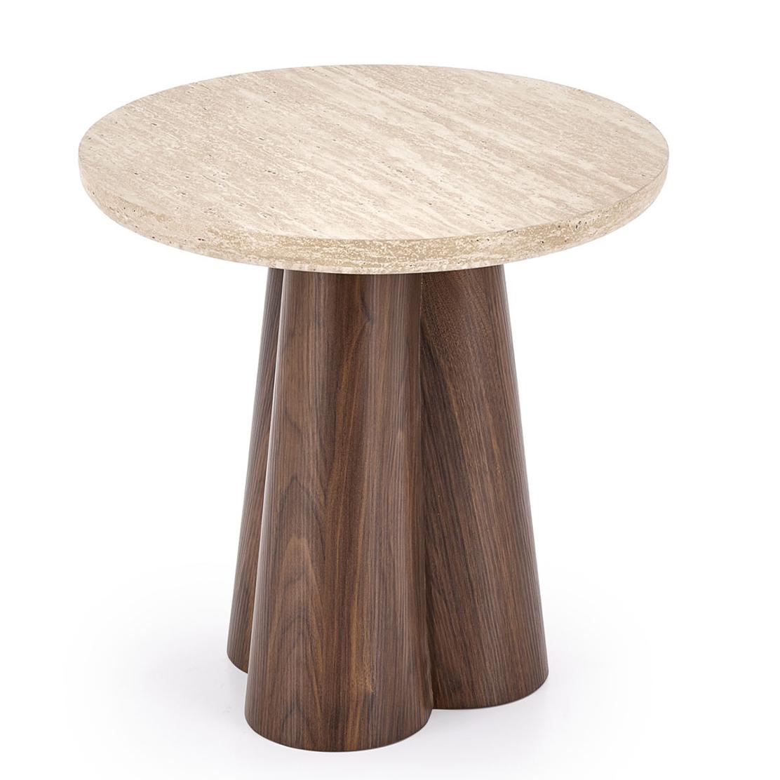 Травертиновият плот впечатлява с естествената си текстура и уникални нюанси, които придават индивидуалност на всяка маса. Основата от фурнирован MDF допълва визията с мекота и стабилност, създавайки балансиран силует, подходящ както за модерни, така и за по-естествени интериорни стилове.