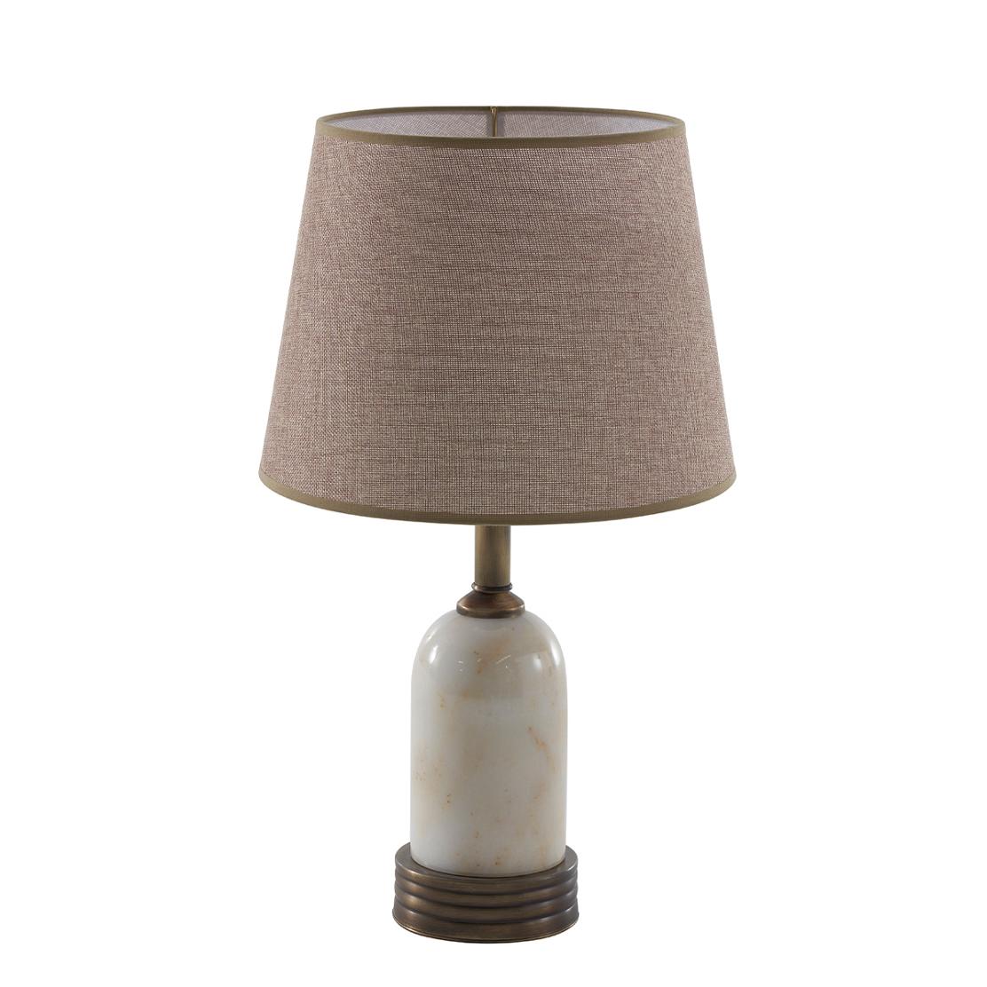 Нощна лампа GORA е с елегантен и класически дизайн, съчетаващ светла, мраморна на вид основа с антични месингови/бронзови акценти и текстилен абажур в неутрален, земен цвят (бежово/светло кафяво). Основата е със заоблена цилиндрична форма, стъпваща върху набраздена метална плоча. Абажурът е трапецовиден, изработен от плат с фина текстура, вероятно лен или подобен материал. Общото впечатление е за високо качество, уют, изтънченост и спокойствие.