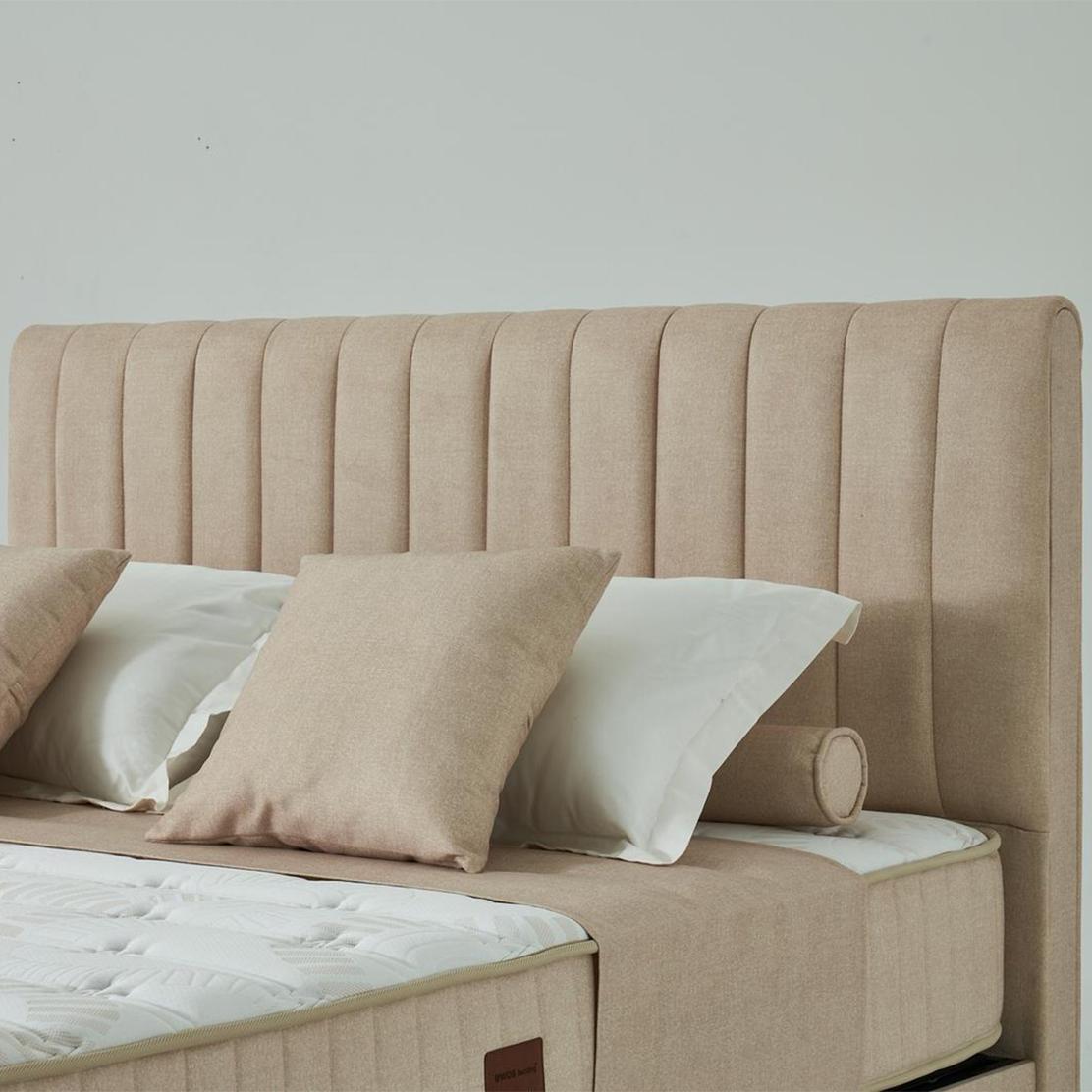 Леглото е изработено с елегантна тапицирана табла, която създава усещане за мекота и лукс. Вграден е механизъм за повдигане с метална подматрачна рамка и ръчно заключваща се система, което осигурява безопасност, стабилност и допълнително пространство за съхранение. Този тип конструкция е идеален за организиране на спалното бельо и сезонни вещи, без да натоварва визуално интериора.