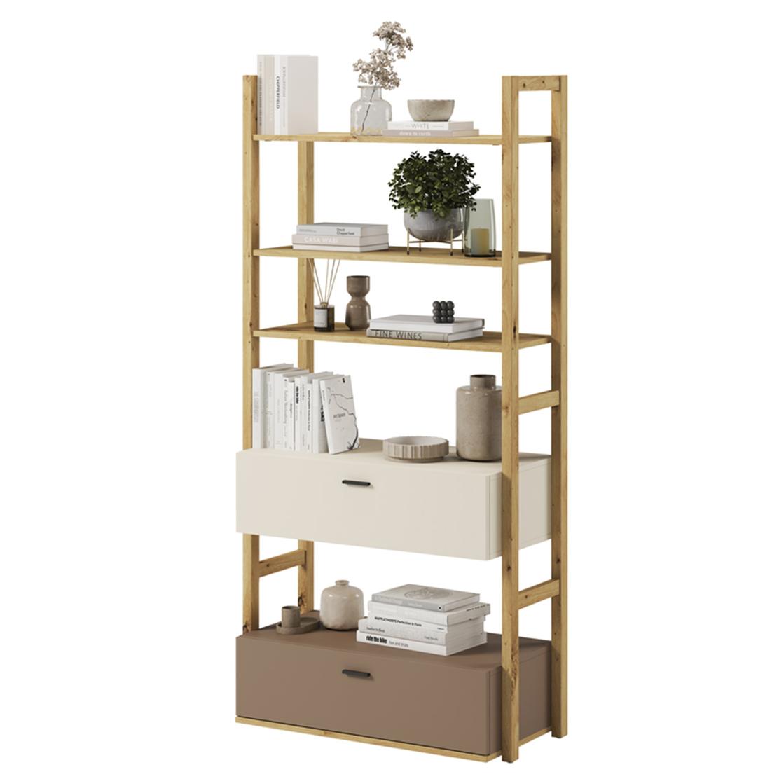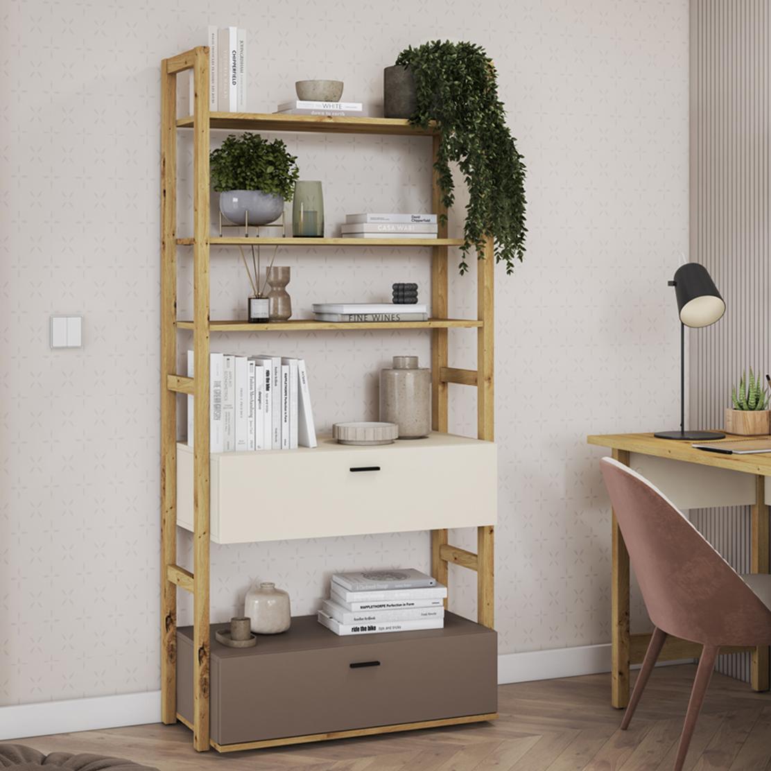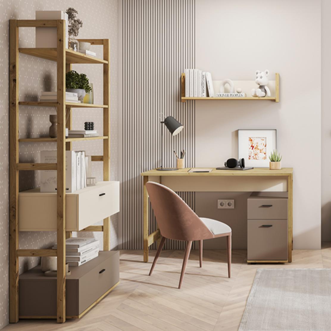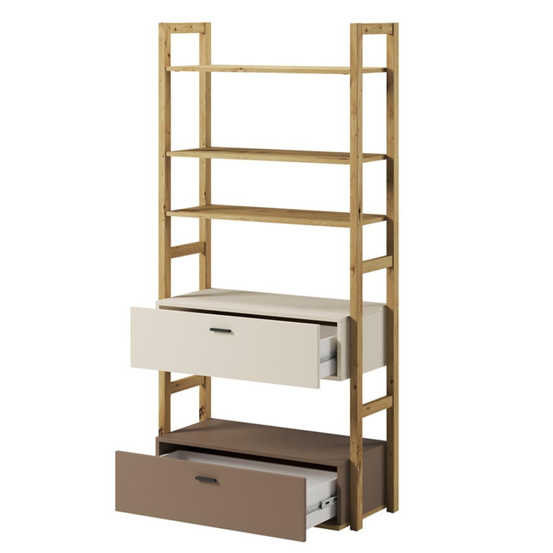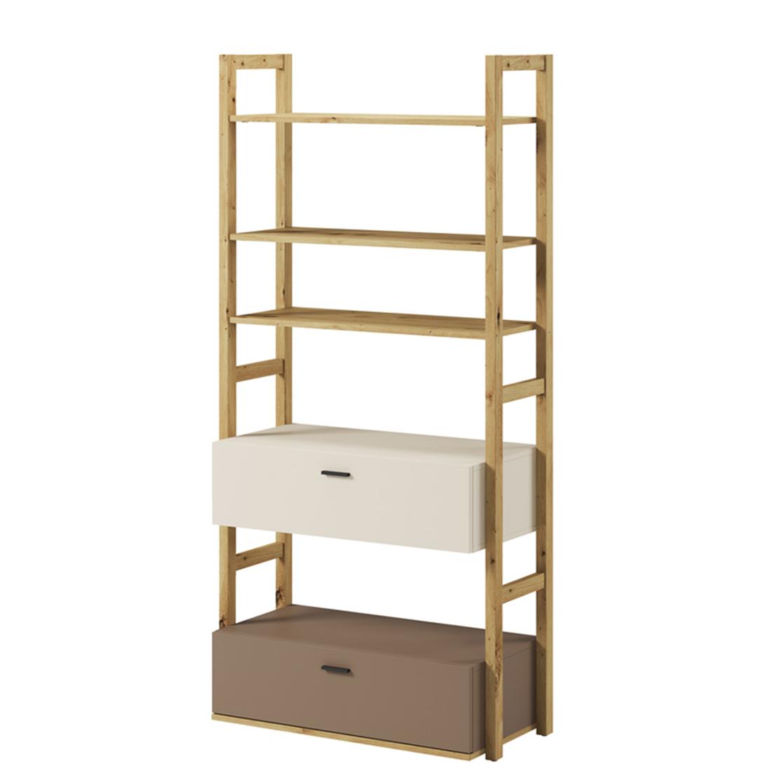 • Цвят: Дъб (корпус/рафтове), Трюфел и Кремав (чекмеджета)