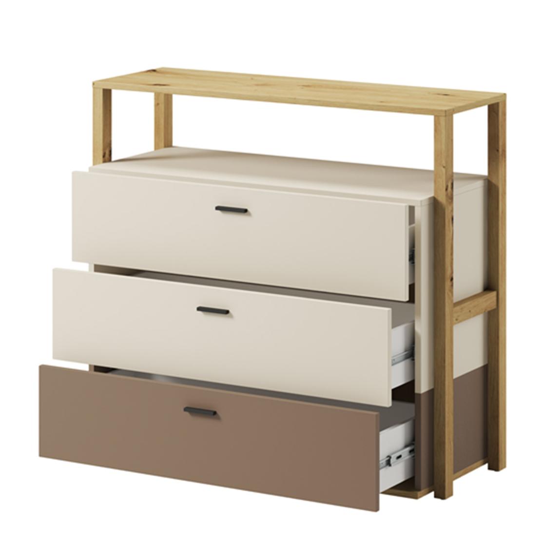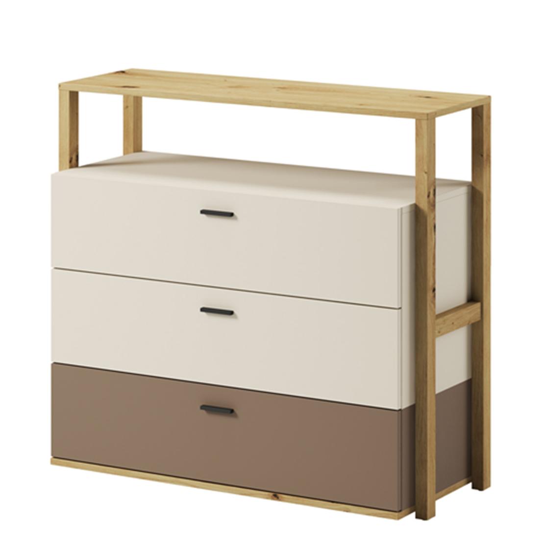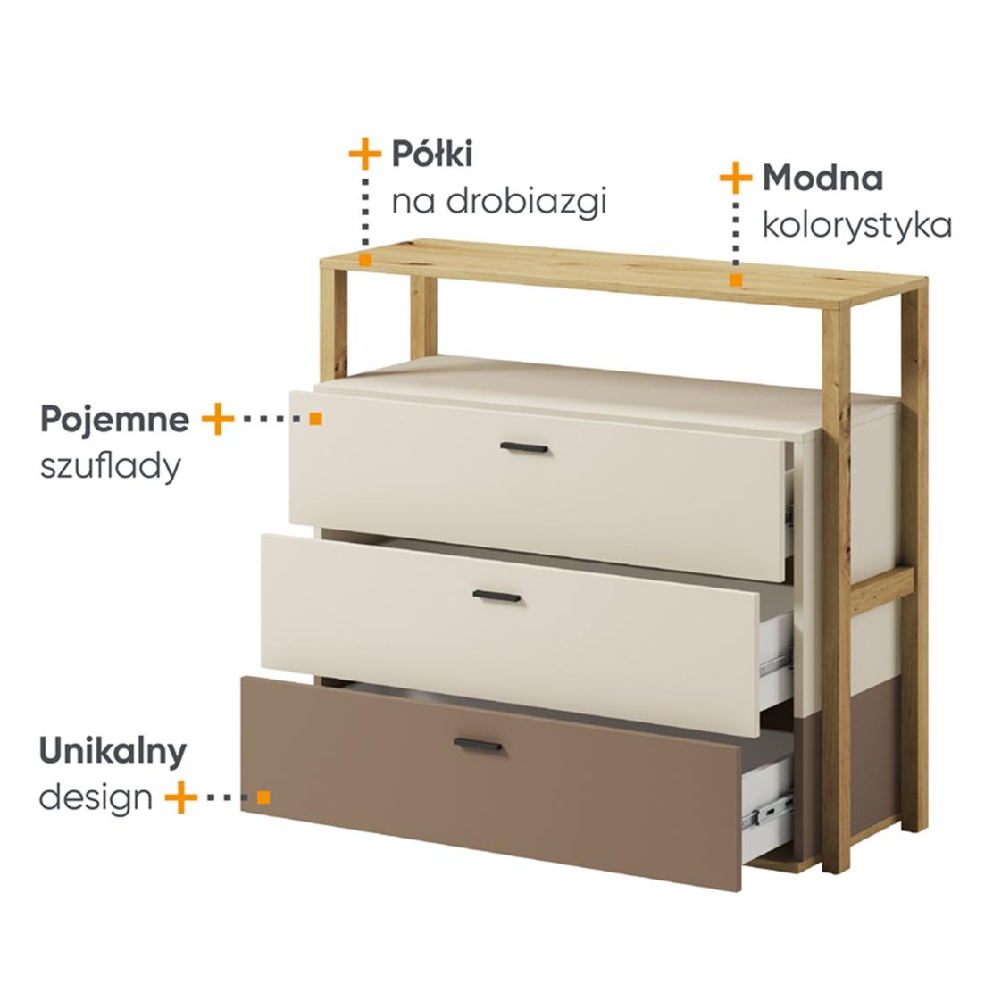 Внесете топлина и безупречен ред в детската стая с нашия очарователен скрин LENNY. Модерният му дизайн и цветова комбинация от бежово, трюфел и дъб, подчертани от елегантни черни дръжки, създават уютна и весела атмосфера за вашето дете.
