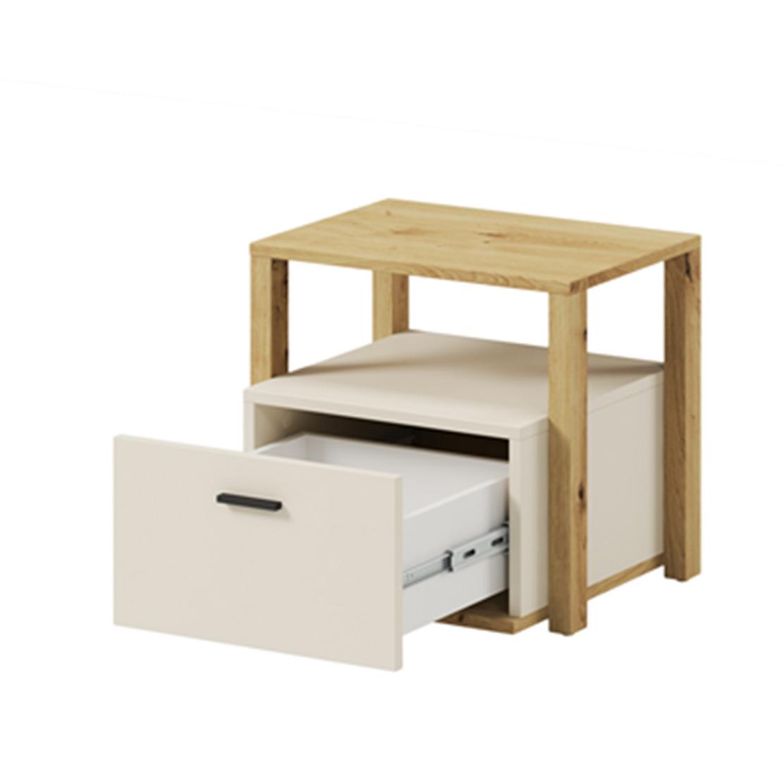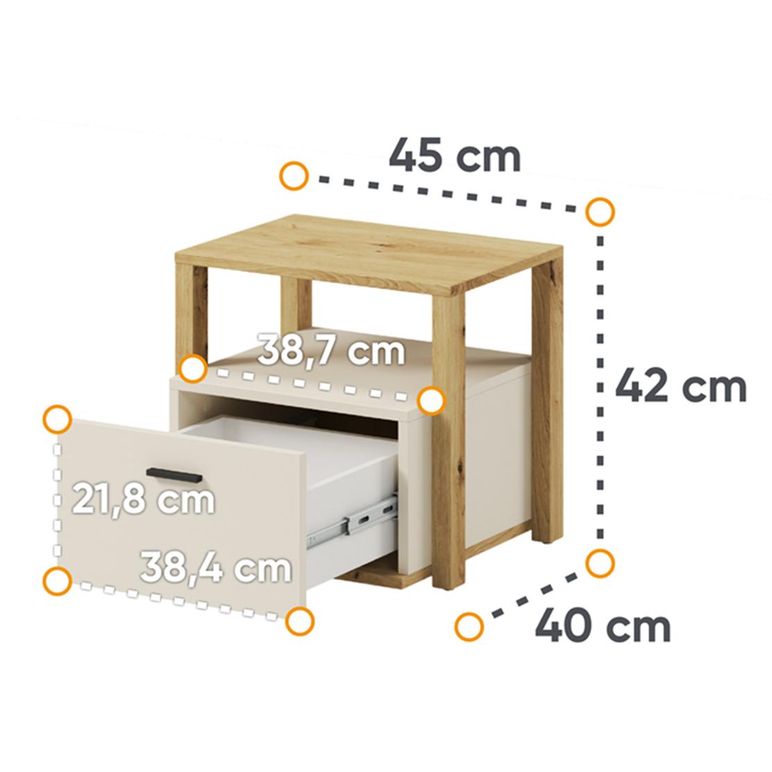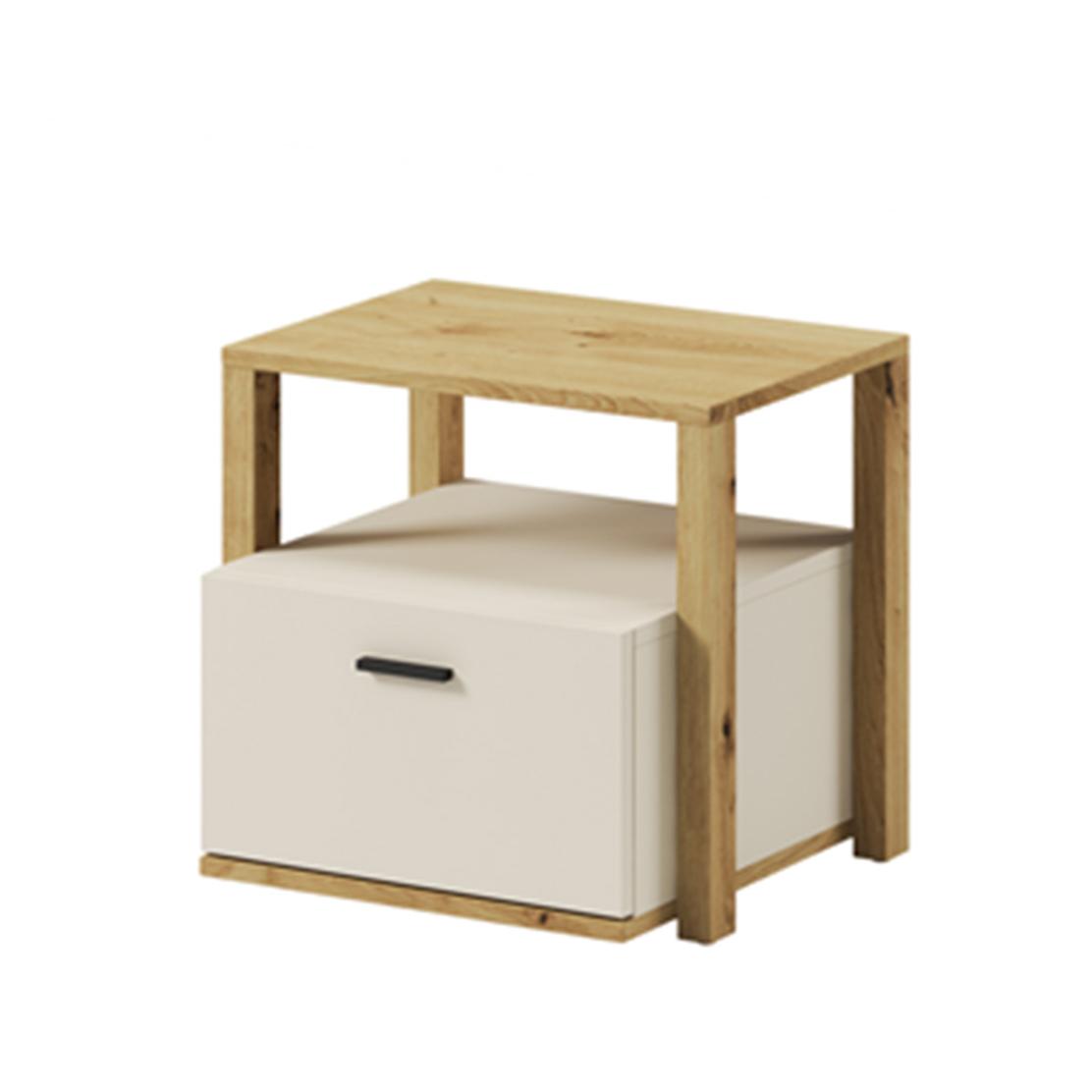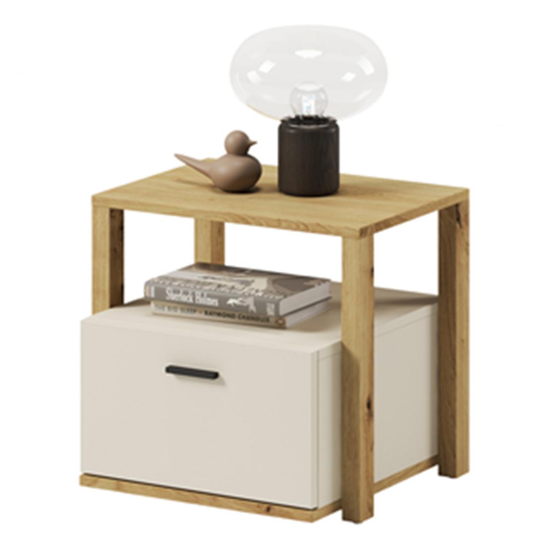 Нощно шкафче LENNY: Модерен дизайн в дъб и бежово за уют и ред до леглото.