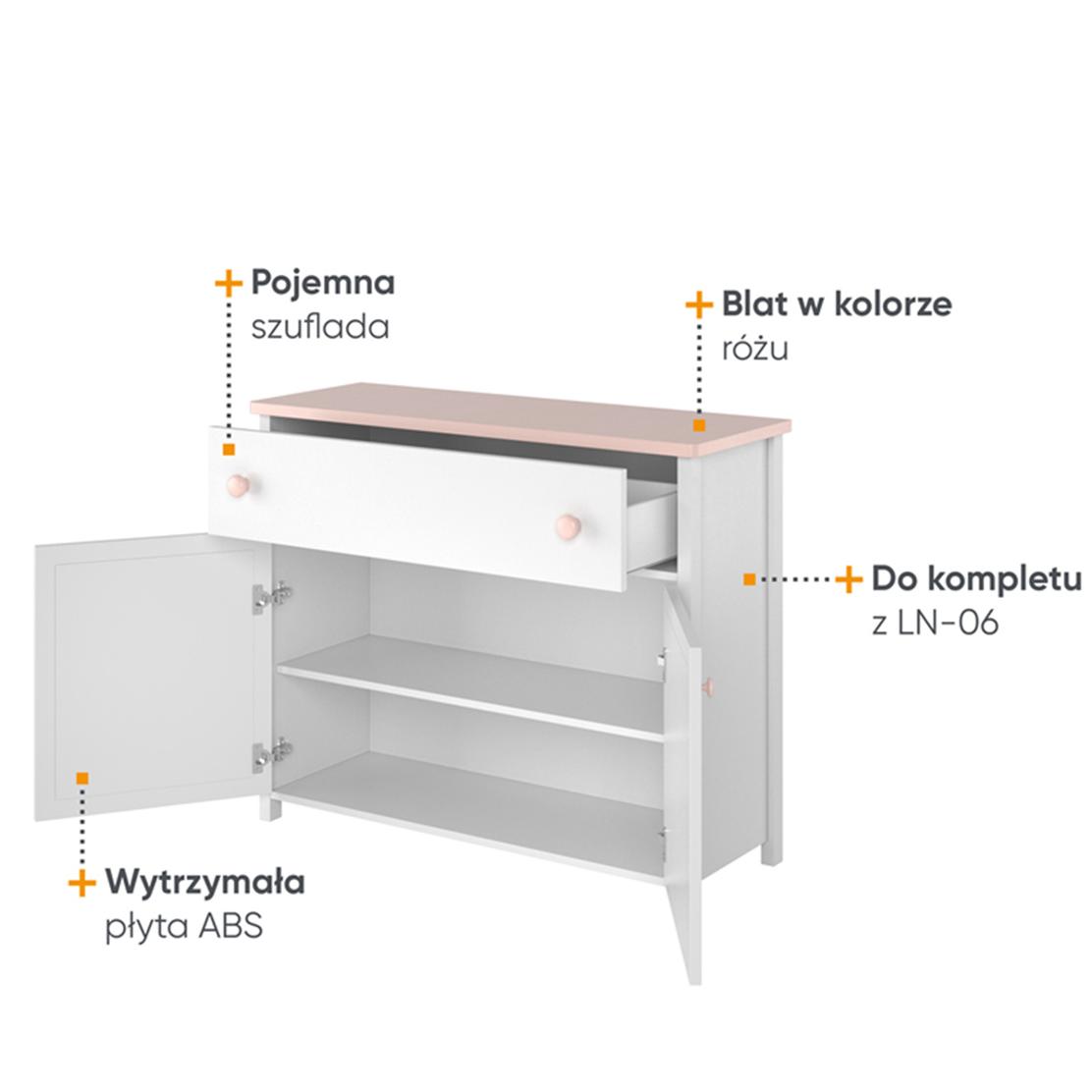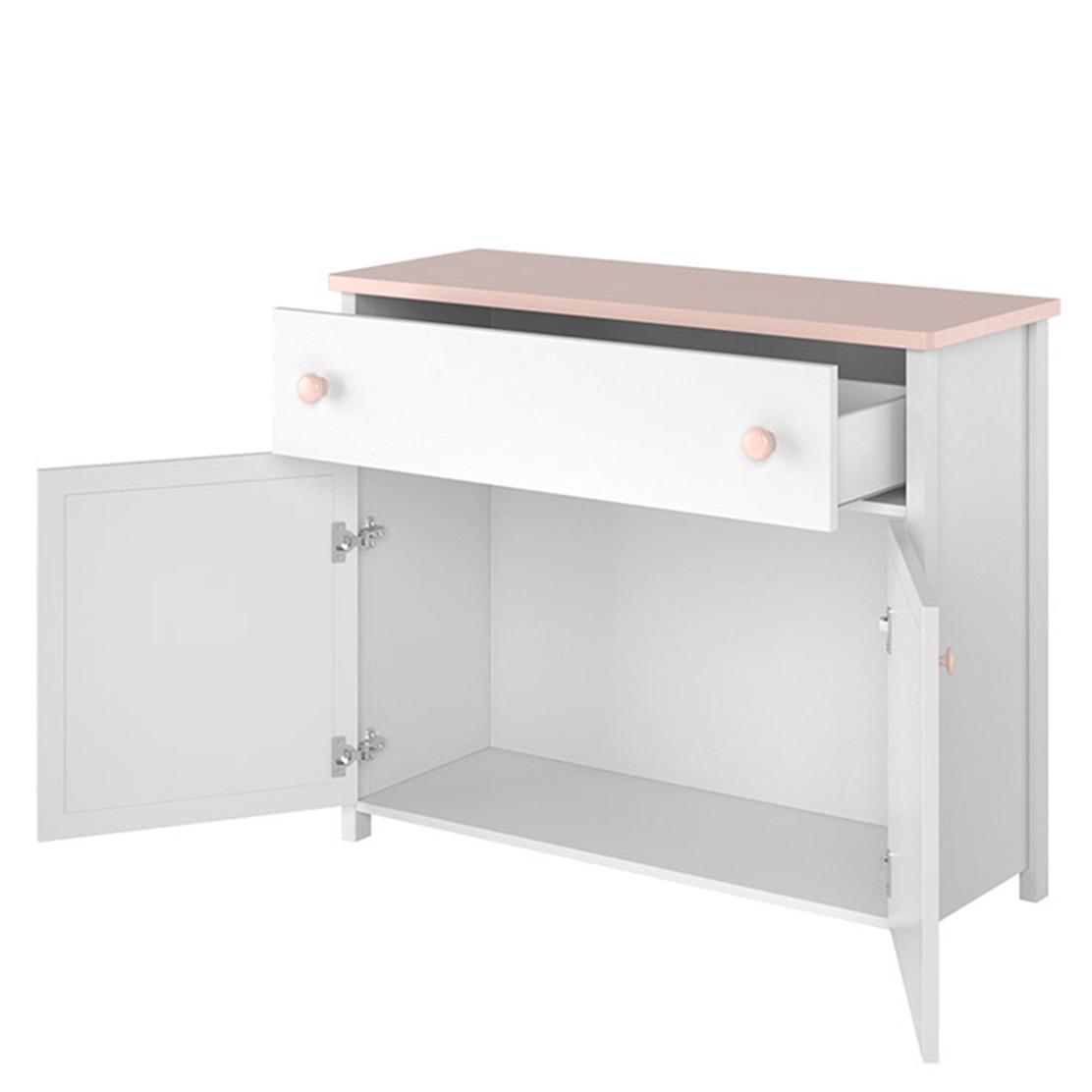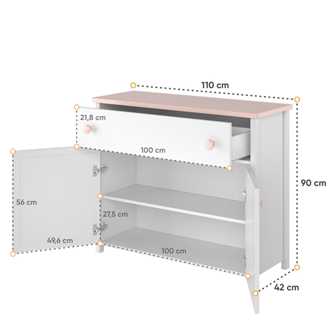 Внесете усмивки и безупречен ред в детската стая с нашия очарователен скрин. Със своя модерен дизайн и комбинация от нежно бяло и свежи розови дръжки, той създава уютна и весела атмосфера, идеална за растежа и игрите на вашето дете.