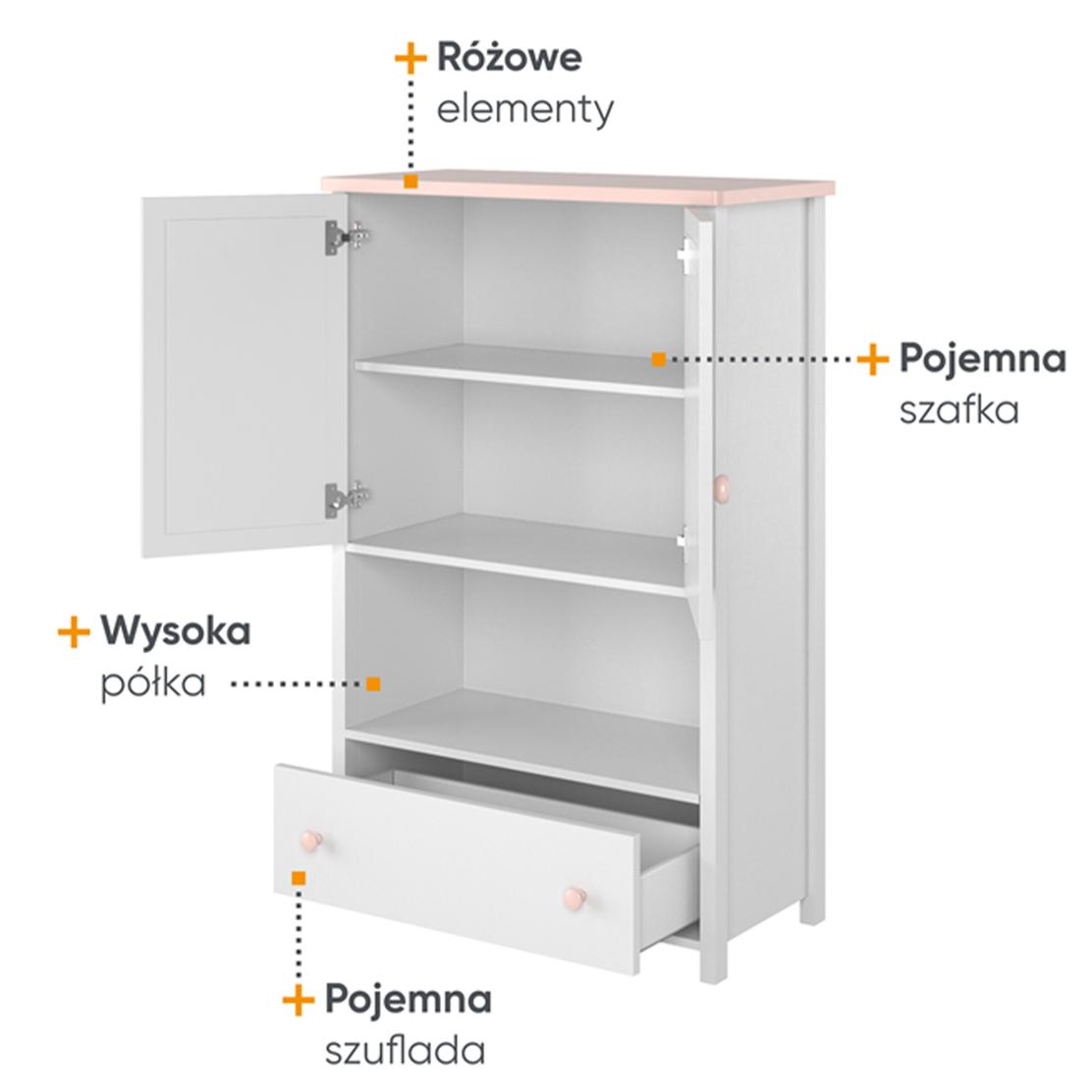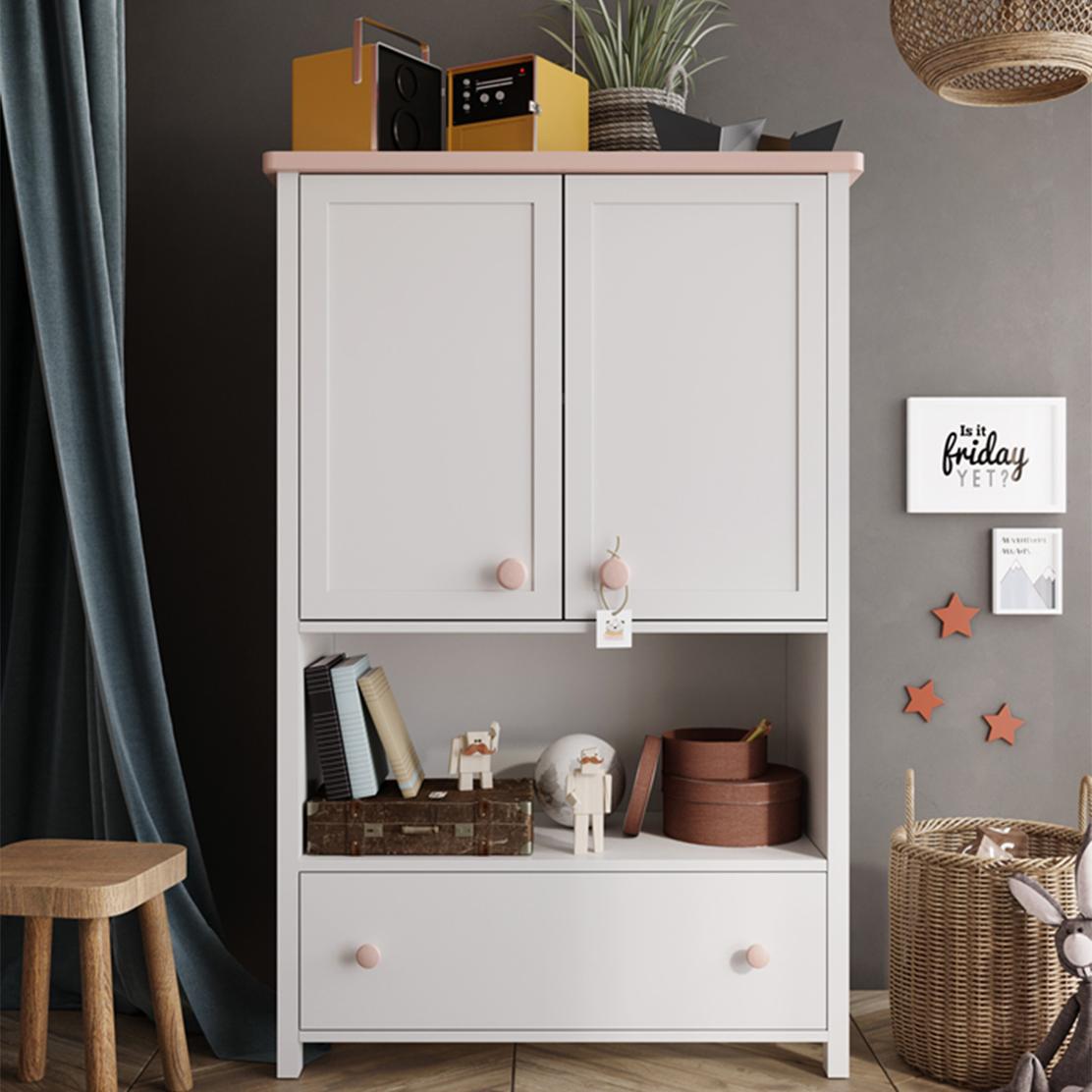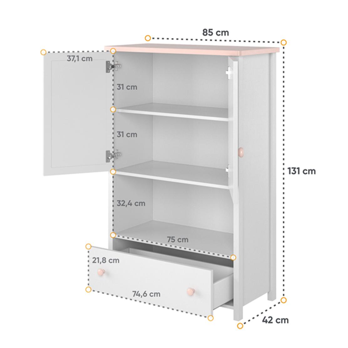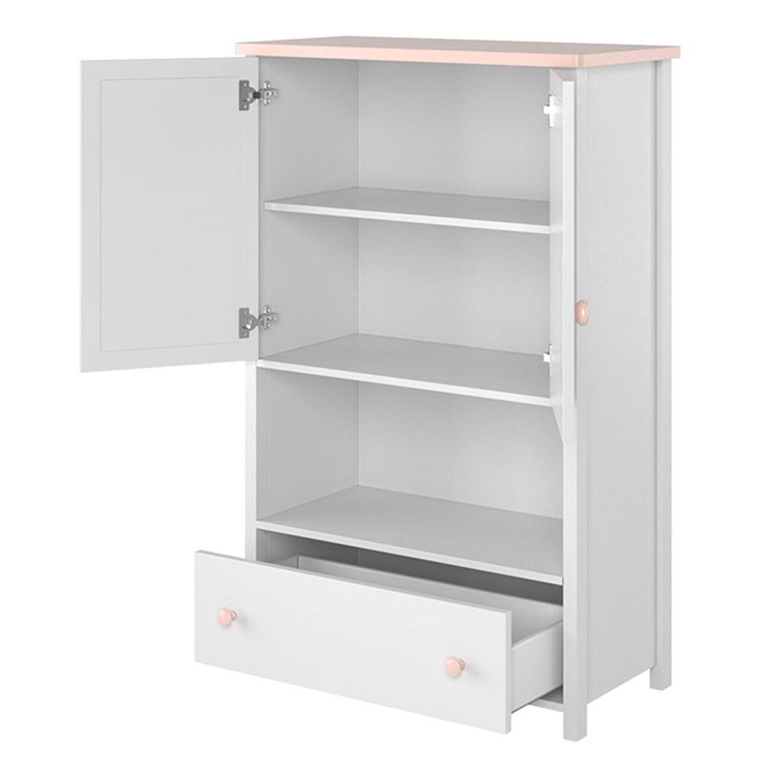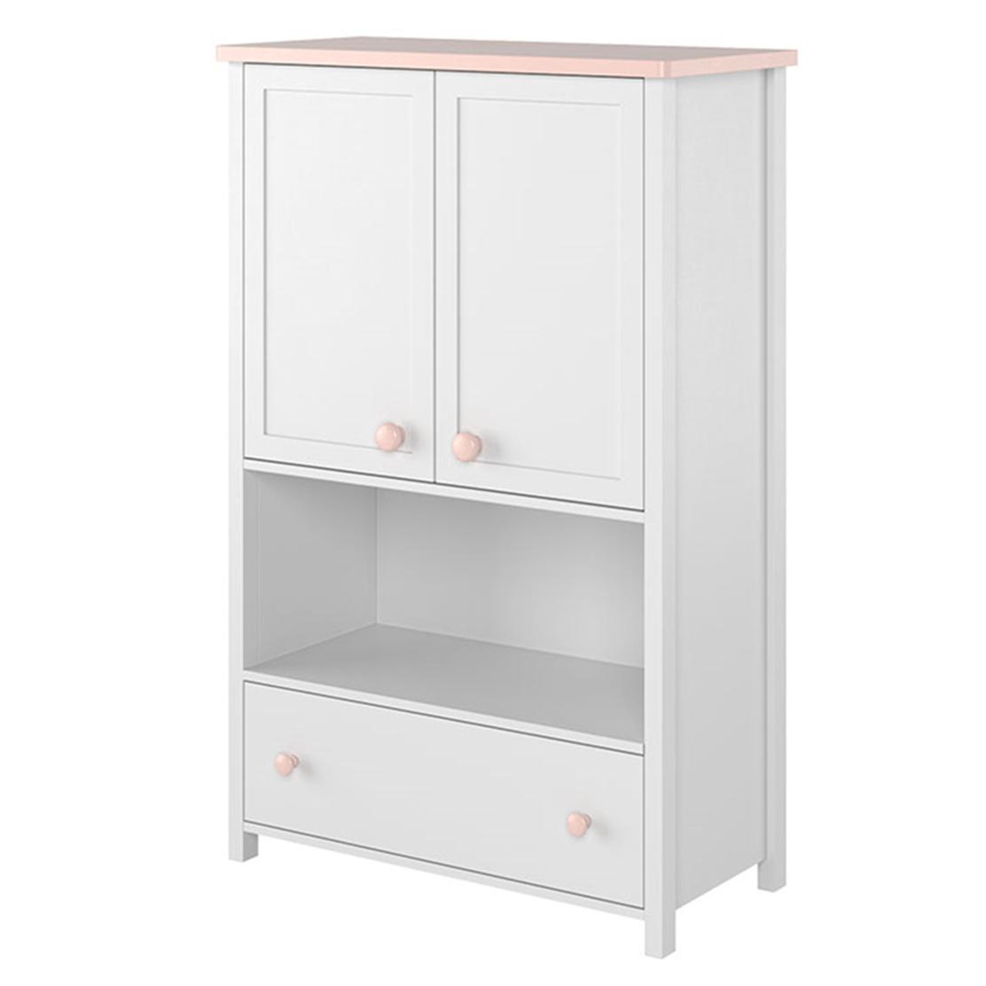 Представяме Ви шкаф етажерка – съчетание от изчистен дизайн и практичност, което преобразява всяка стая. Белият цвят и деликатните розови акценти внасят свежест и уют. Идеален за детска стая, спалня или модерен хол, предлагайки подреден и стилен дом.