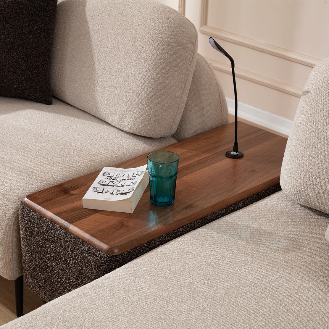 Обогатете своя модулен диван с модула Madrid с вградена масичка – елемент, който съчетава премиум комфорт и практичност в хармонична, модерна визия. Горната част от букова дървесина добавя естествен акцент и топлина към интериора, докато меката тапицирана основа с пълнеж от високоеластична пяна 30DNS осигурява стабилност и приятно усещане при допир.