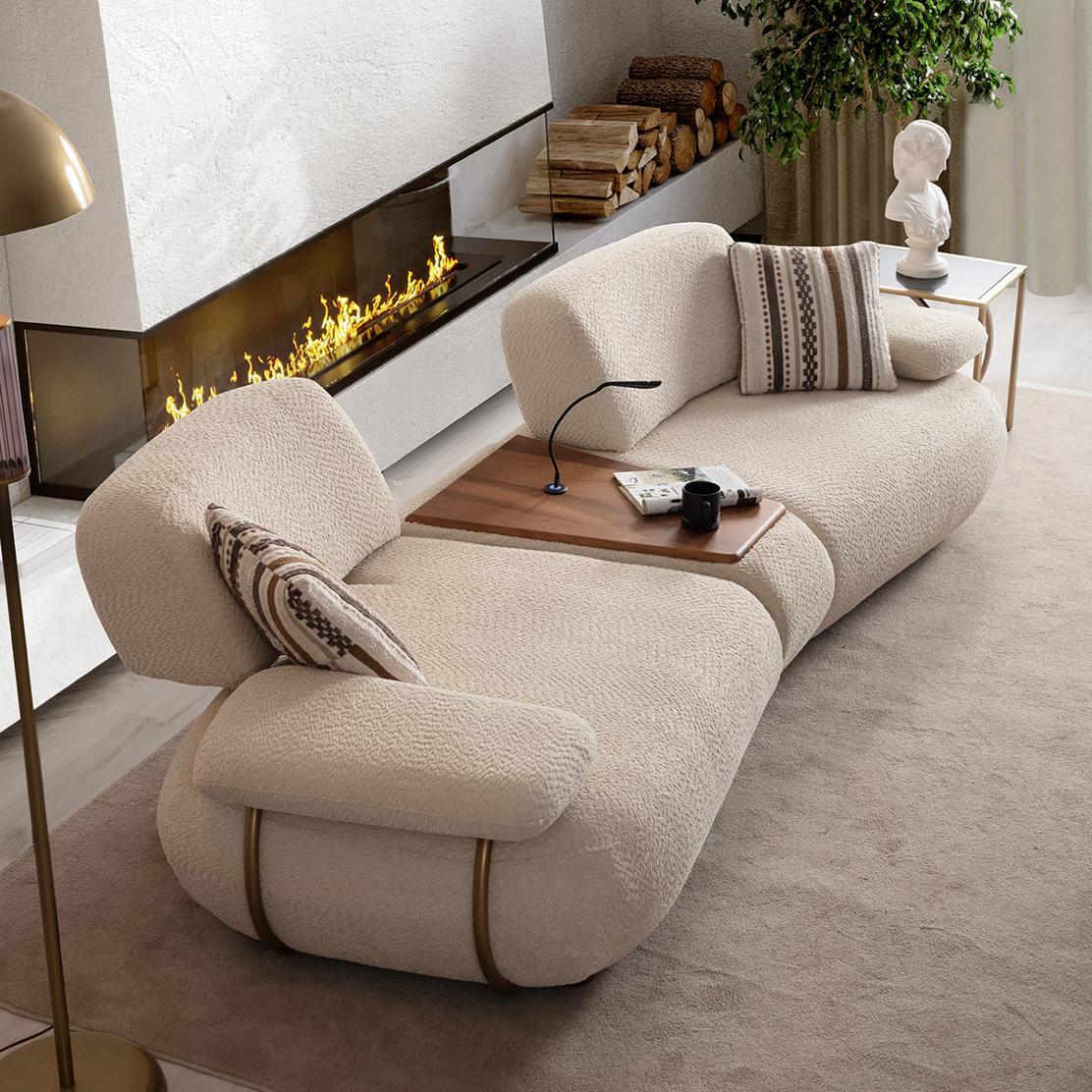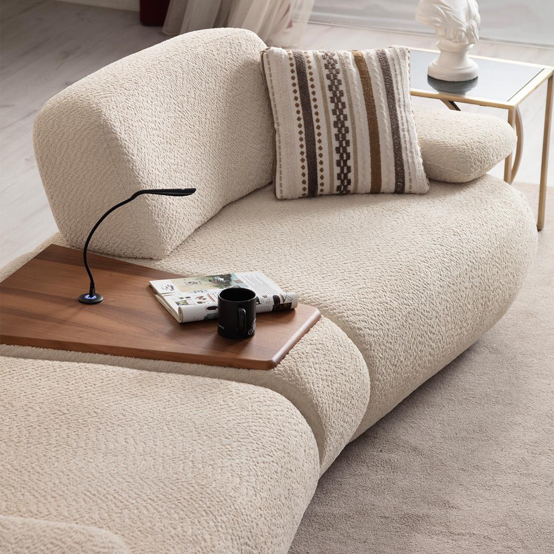 Модулът с масичка seamlessly се вписва в линейни, ъглови или комбинирани конфигурации, като добавя удобство и визуален акцент. Той е отличен заместител на външни помощни масички, когато търсите интегриран уют и компактно решение.
