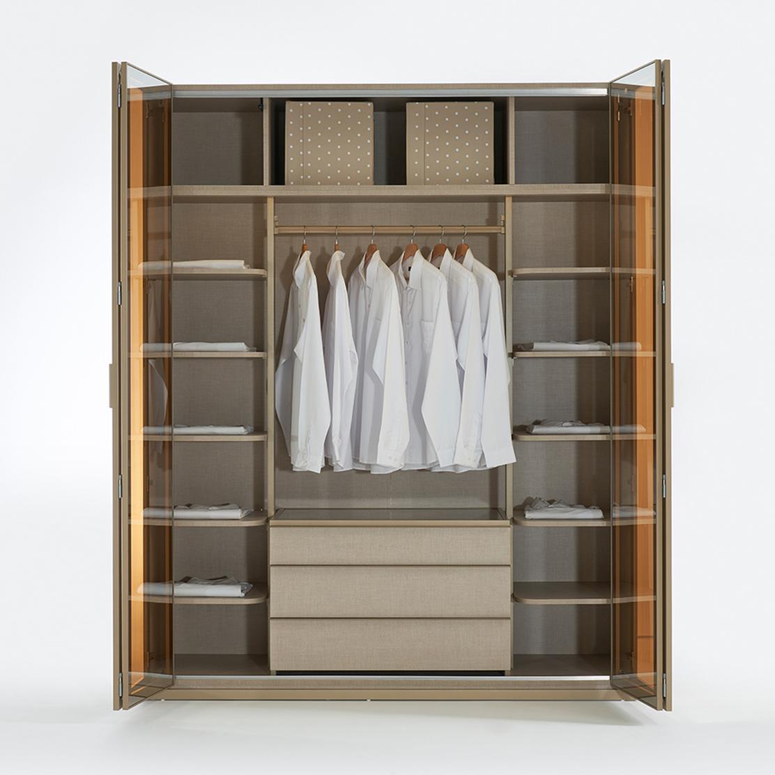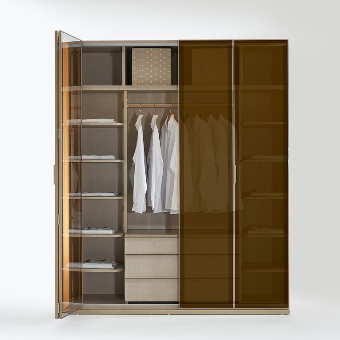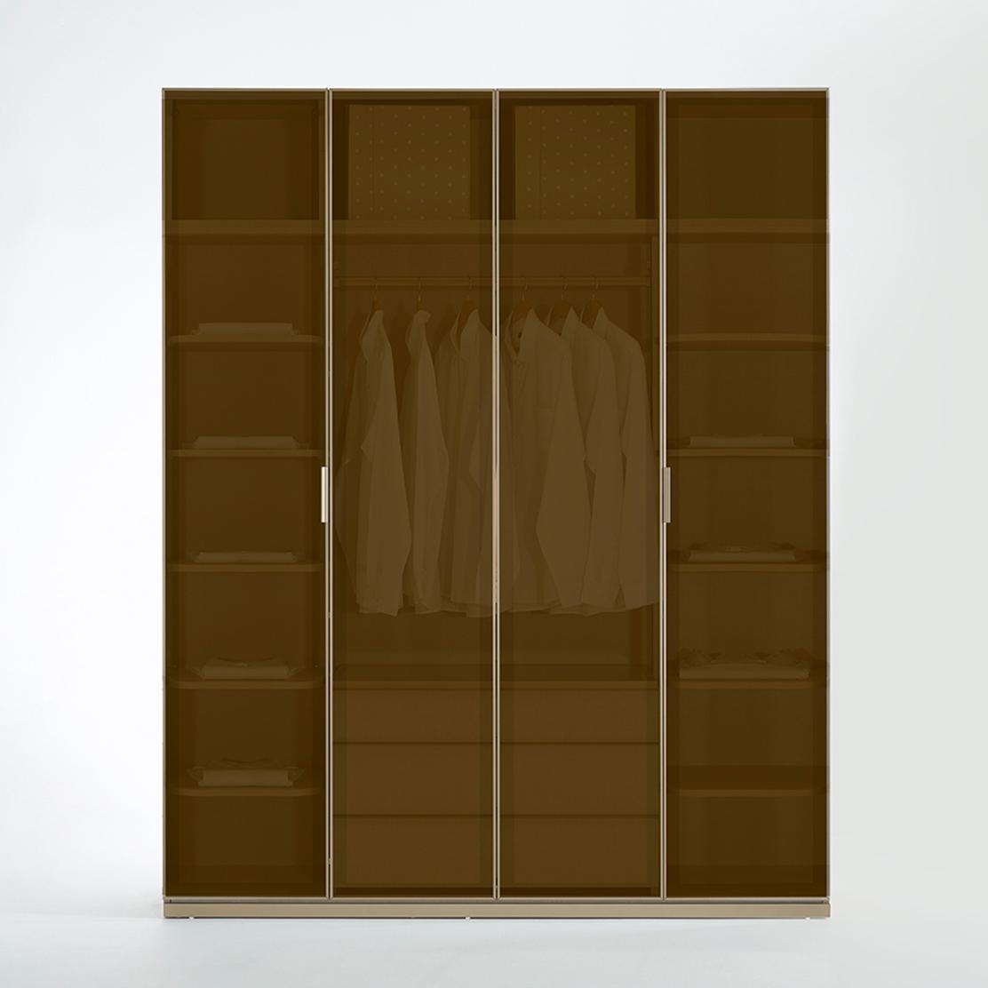 Открийте изтънчеността на гардероб META. Четирите му крила от темперирано стъкло и елегантна рамка в сатениран бронз внасят модерен лукс. Дискретният прозрачен дизайн е стилен акцент в спалнята ви.