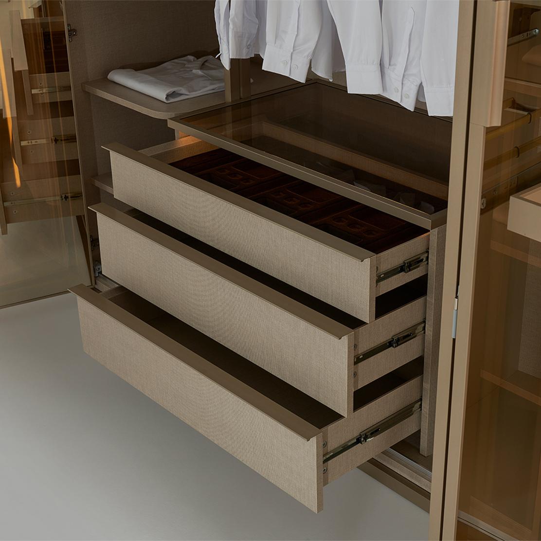 • Разнообразно вътрешно разпределение с рафтове, лостове за дрехи и чекмеджета.