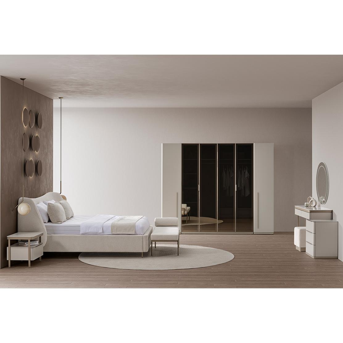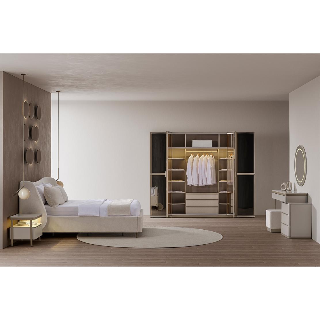 Изберете идеална конфигурация с тапицирано легло, елегантен гардероб със стъклени врати и стилни нощни шкафчета. Всеки елемент е проектиран за удобство, осигурявайки хармония и модерен дизайн.