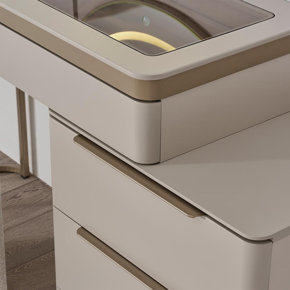 Изработена с чекмеджета от MDF в цвят пясъчно бежово и здрави железни крака в сатениран бронз, тя съчетава издръжливост с лукс. Механизмите за плавно затваряне осигуряват тиха и комфортна употреба всеки ден.