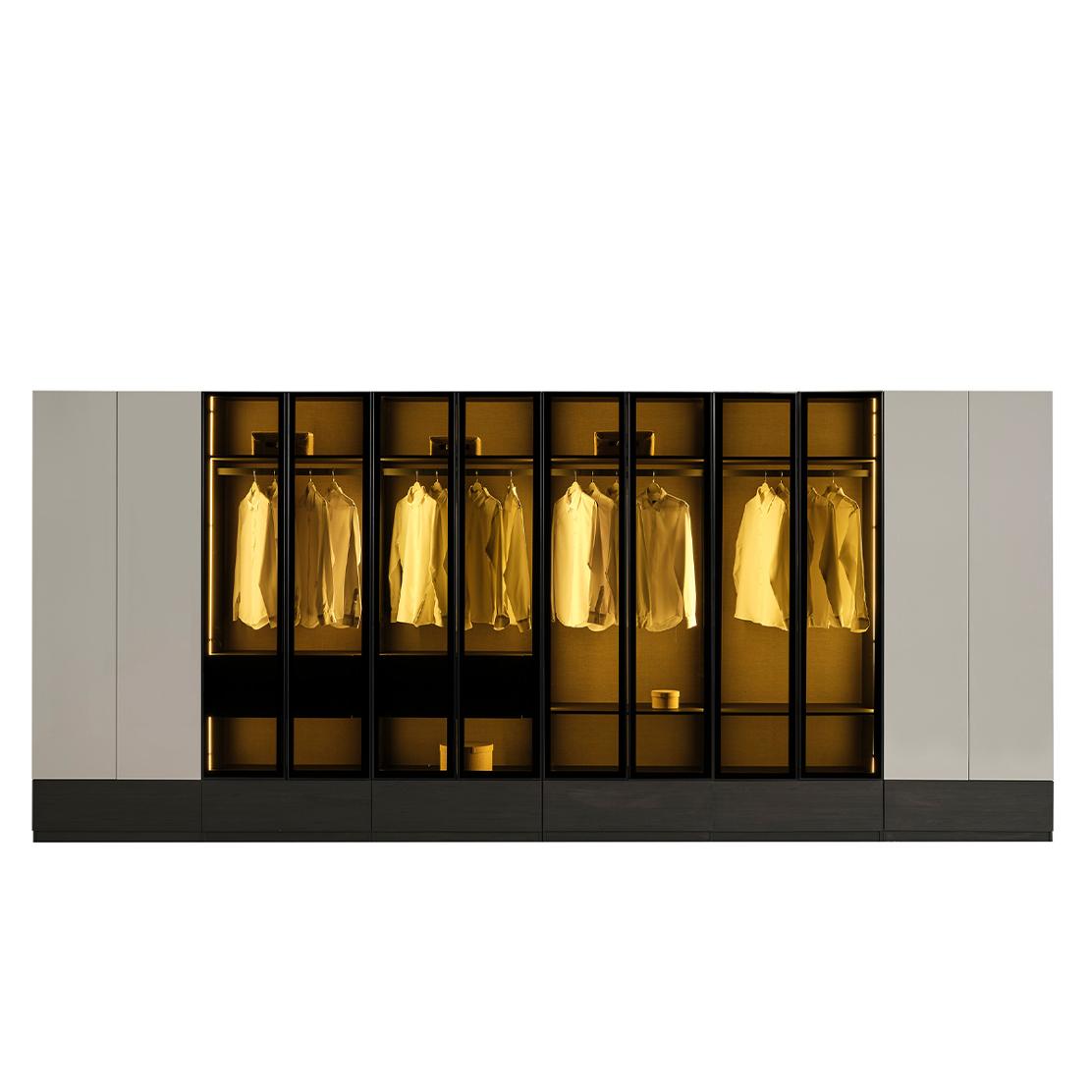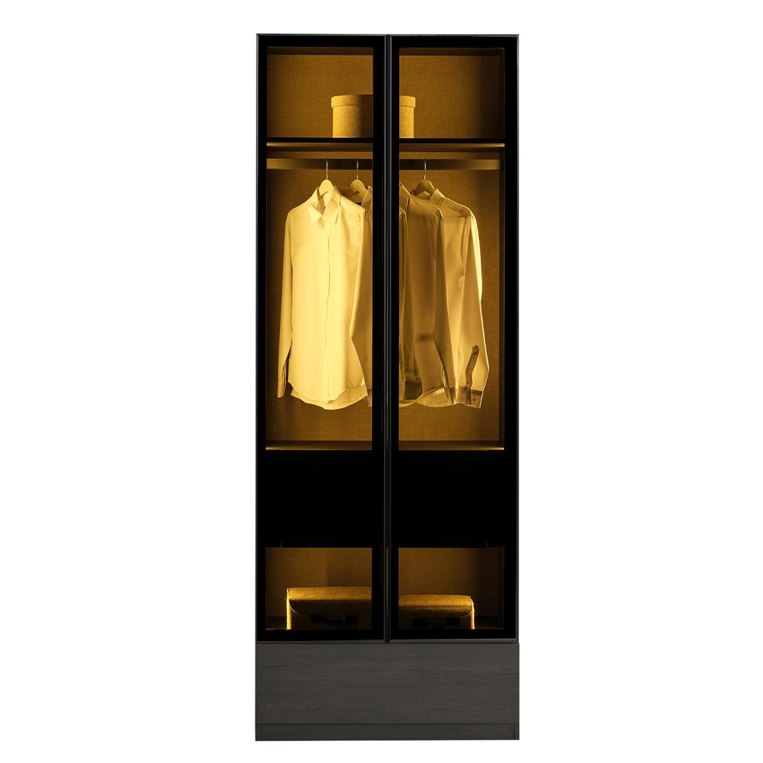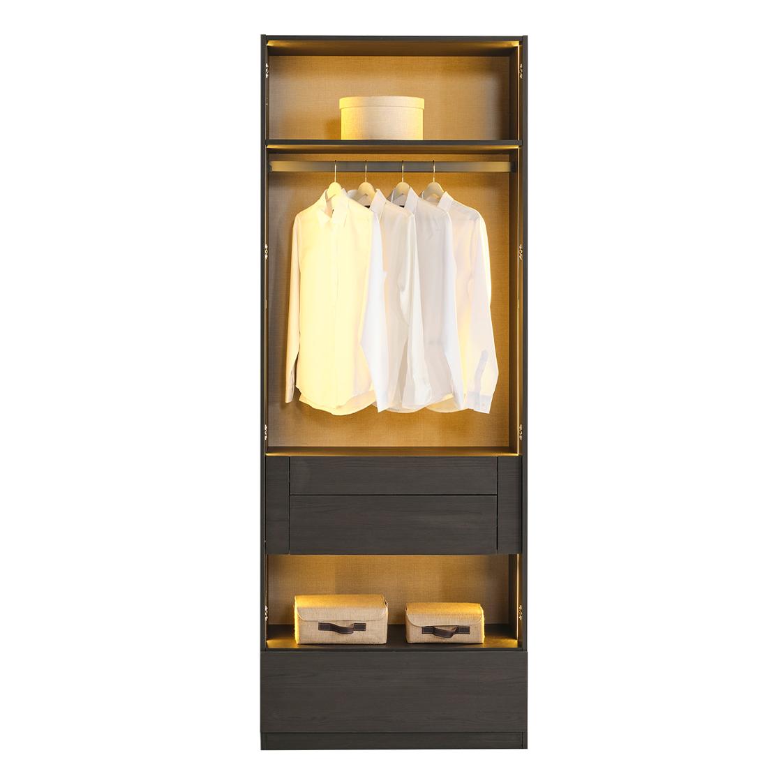 Вграденото LED осветление добавя дискретна светлина във вътрешността, подчертавайки всяка дреха и аксесоар. Практичният лост за закачалки осигурява достатъчно място за костюми, ризи и палта, докато двете чекмеджета в долната част са идеални за подреждане на бельо, аксесоари или сгънати дрехи.