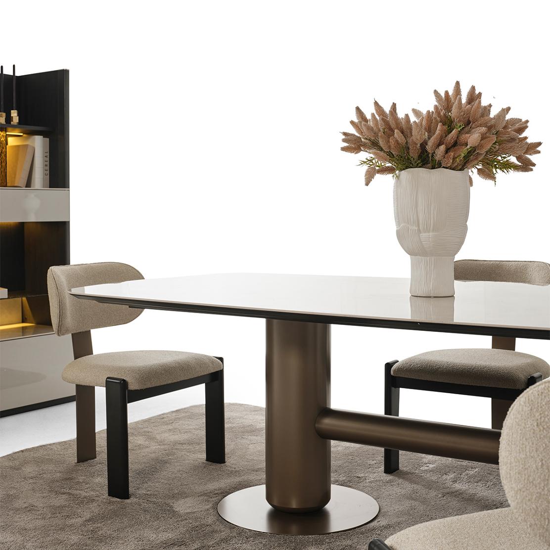 Плотът от висококачествена керамика впечатлява с изтънчена визия и естествена текстура, напомняща мрамор, като същевременно е устойчив на надраскване, топлина и петна. Металните крака придават изключителна стабилност и модерен индустриален акцент, който се вписва без усилие в разнообразни интериорни стилове – от минимализъм до луксозен съвременен дизайн.