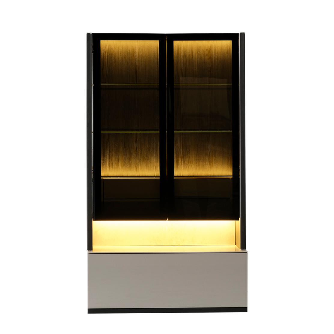 Създайте елегантен акцент с витрина MOON. Изчистен дизайн, съчетаващ матово сиво лаково покритие и темперирано стъкло, придава модерен лукс. Керамичният плот добавя здравина и изтънченост, идеален за излагане на ценни предмети.