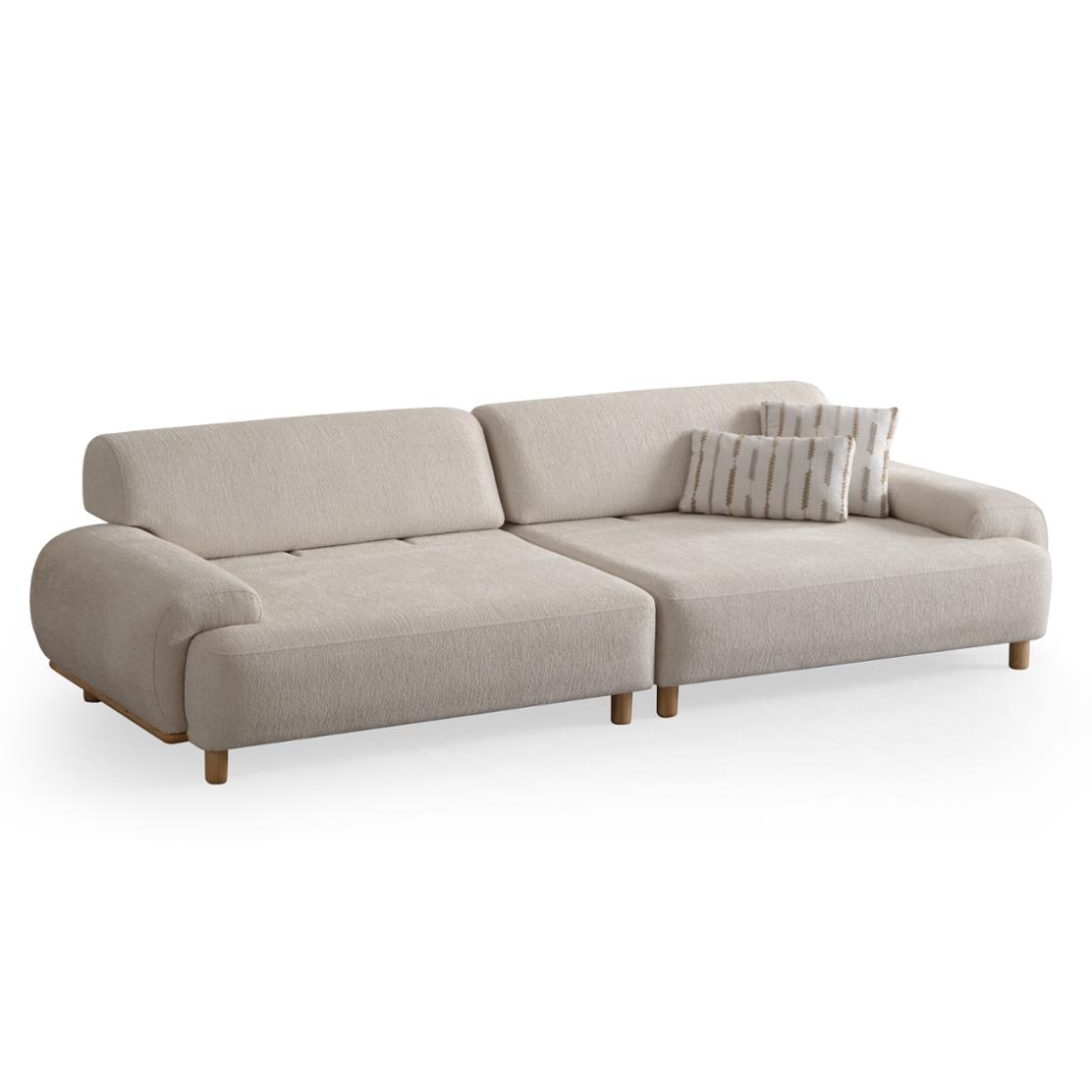 Диванът е тапициран в висококачествен текстил, устойчив на износване и лесен за поддръжка. Меката текстура и стилните извивки създават усещане за уют и модерен комфорт.