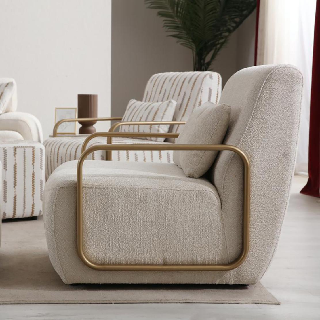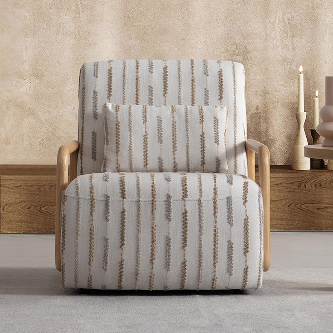Креслото е тапицирано с висококачествен текстил, който е приятен на допир и устойчив на износване. Меката му текстура подчертава модерния характер на модела и придава уютна, премиум ненатрапчива визия.