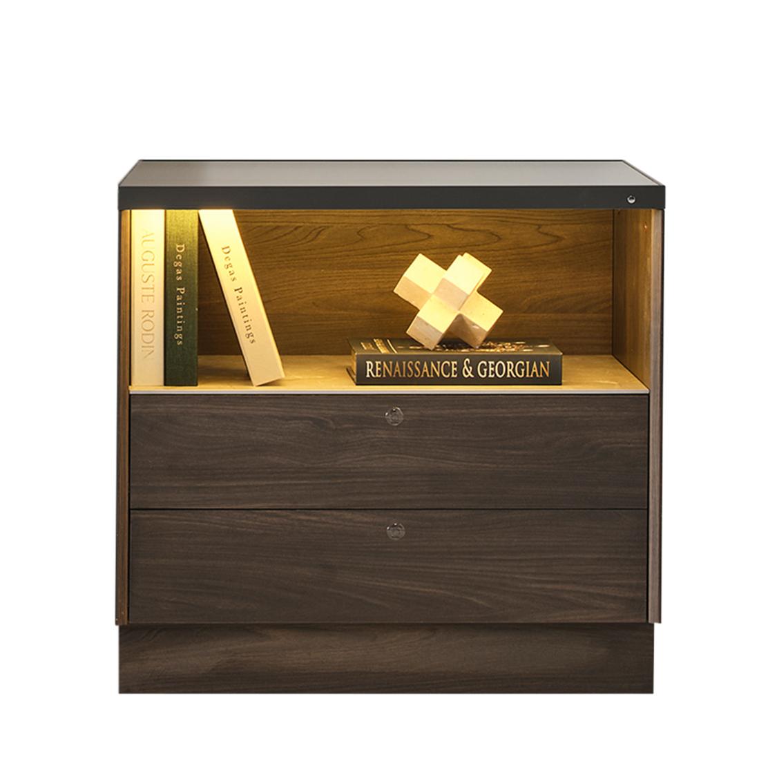 Двете чекмеджета предлагат дискретно съхранение за Вашите вещи, а техният плавен механизъм осигурява безшумно затваряне. Отворената ниша с топла светлина е идеална за любимите Ви книги или декорации, създавайки завършен и функционален кът.