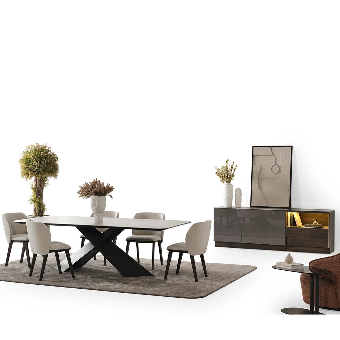 Керамичният плот не само изглежда великолепно, но е и изключително устойчив на надрасквания, петна и високи температури. С X-образната си черна метална основа, масата осигурява стабилност и максимално пространство за краката. Насладете се на лесна поддръжка и безкомпромисна красота всеки ден.