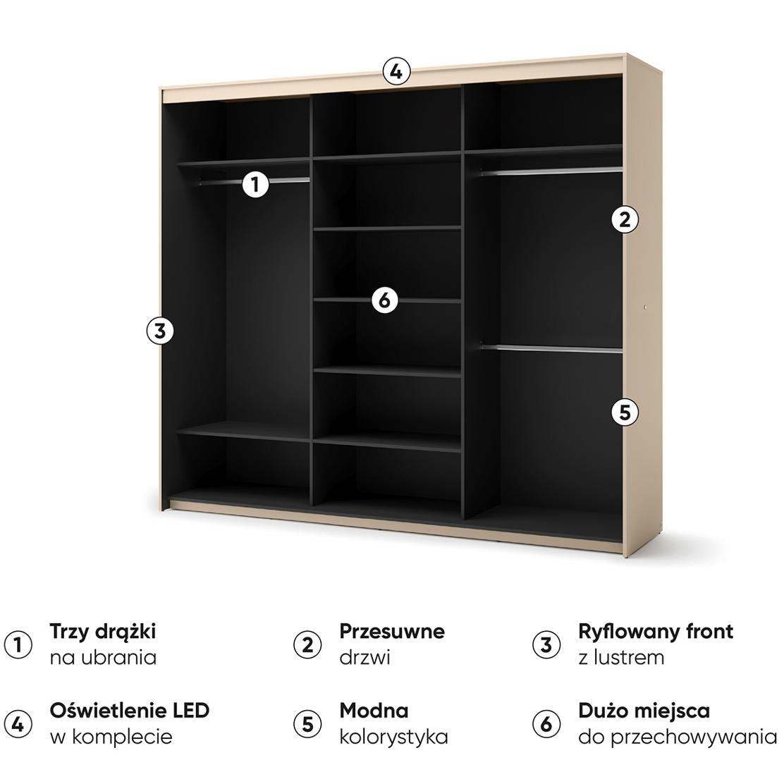 Насладете се на безупречна организация благодарение на интелигентното вътрешно разпределение. С LED осветление, всяка дреха е лесно откриваема, а многобройните рафтове и лостове гарантират, че всичко е на мястото си. Ние Ви предлагаме комфорт и стил всеки ден.