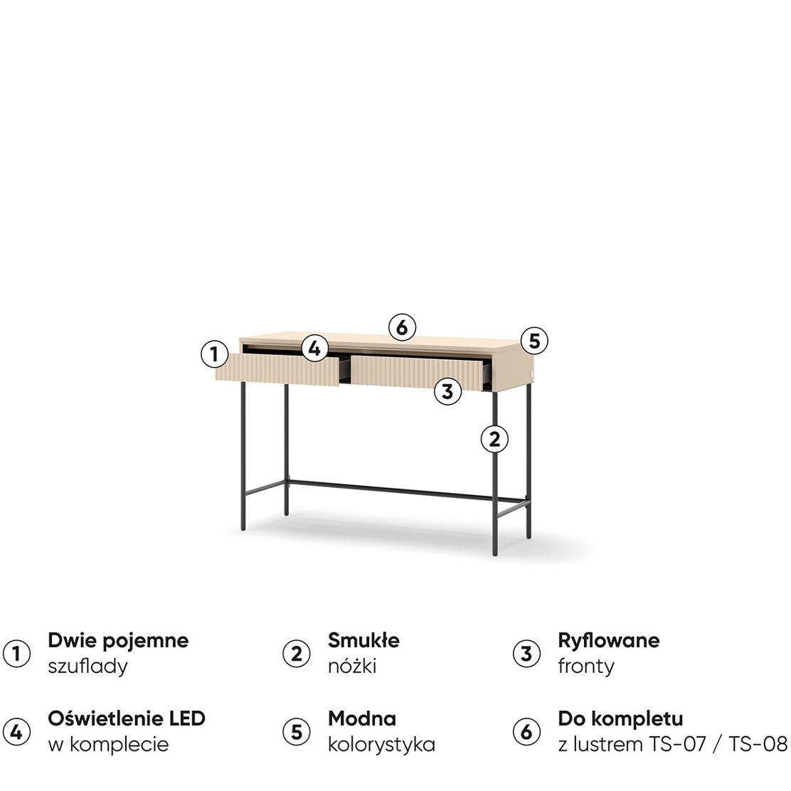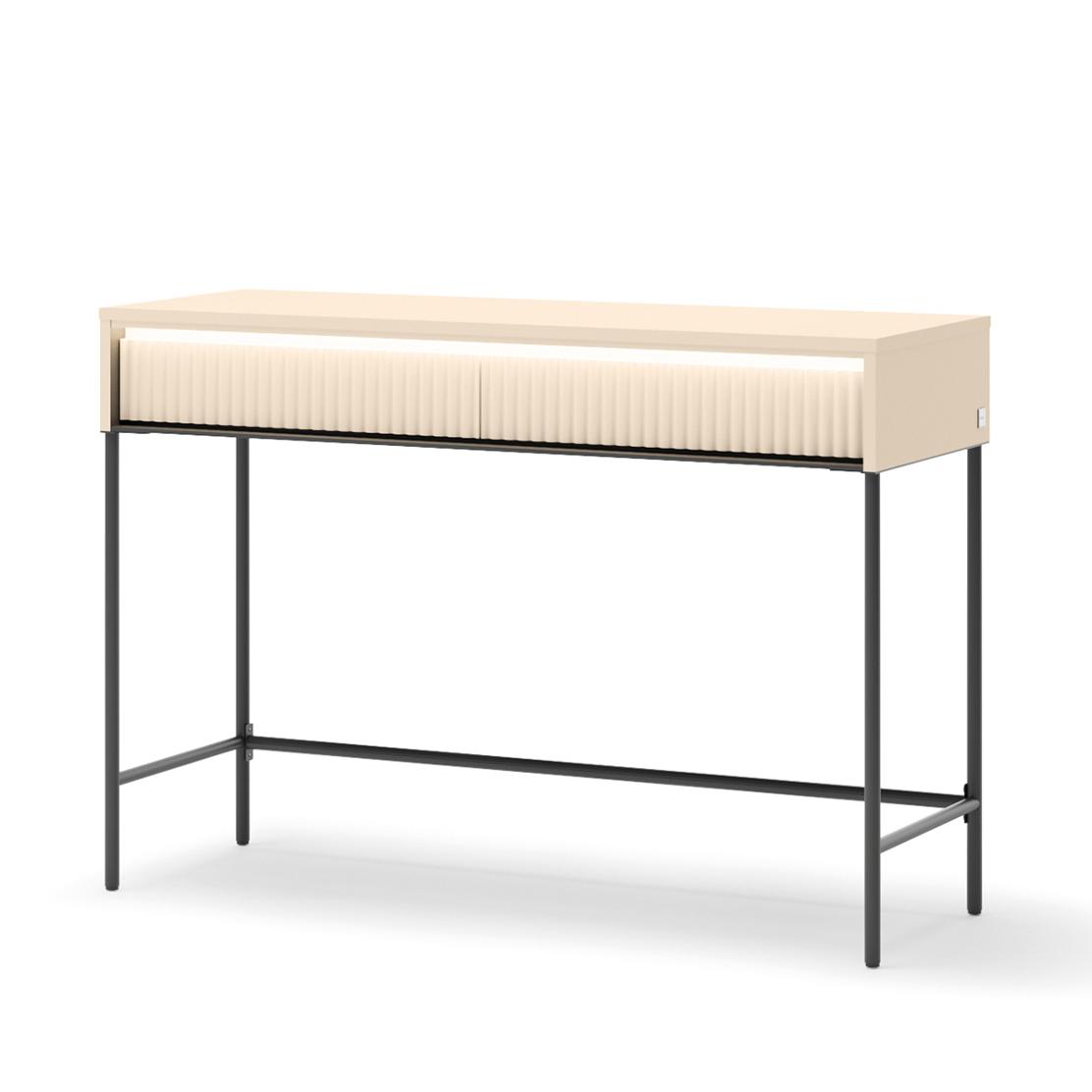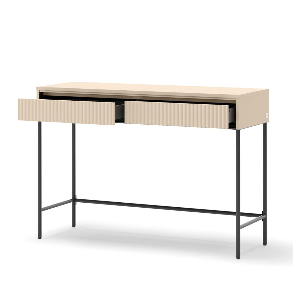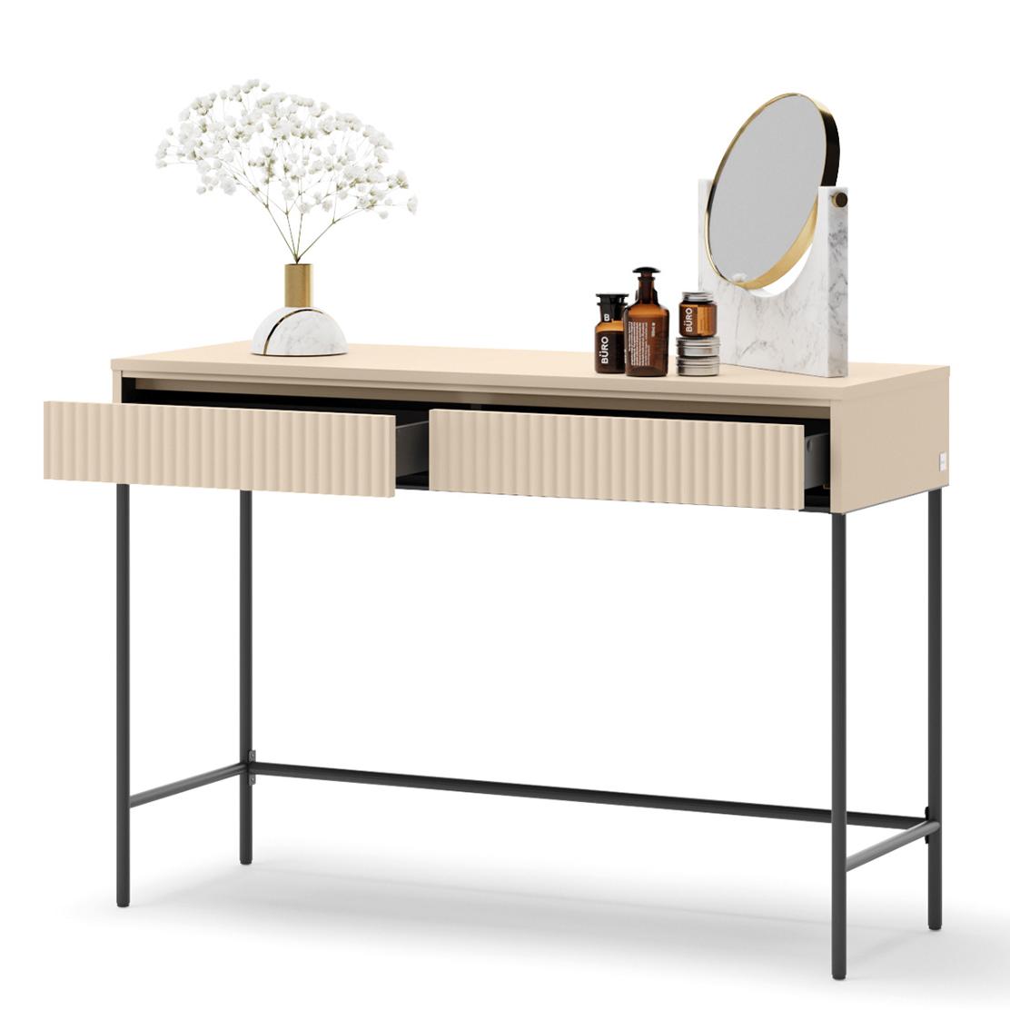 Създайте кът за красота и вдъхновение с тоалетка TREND. Изчистеният дизайн в пясъчно бежово, с фини метални крака и релефни чекмеджета, внася модерна елегантност. Ще усетите премиум качеството и вниманието към всеки детайл.