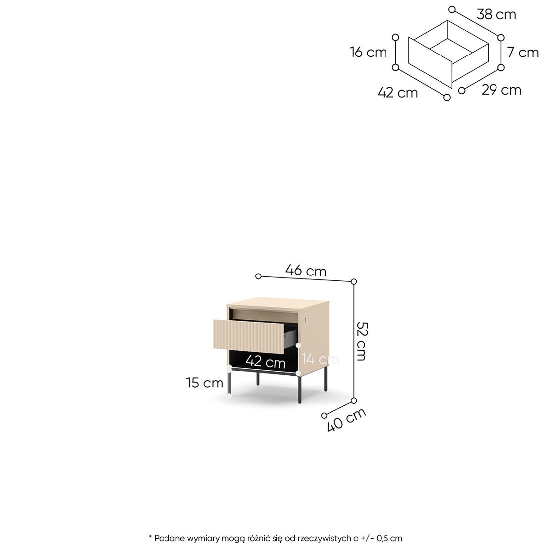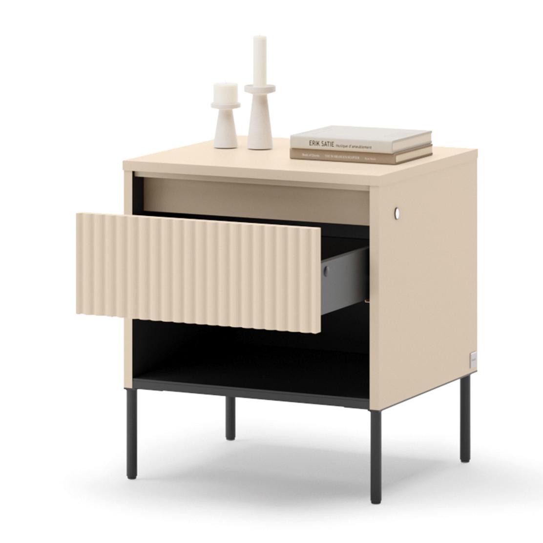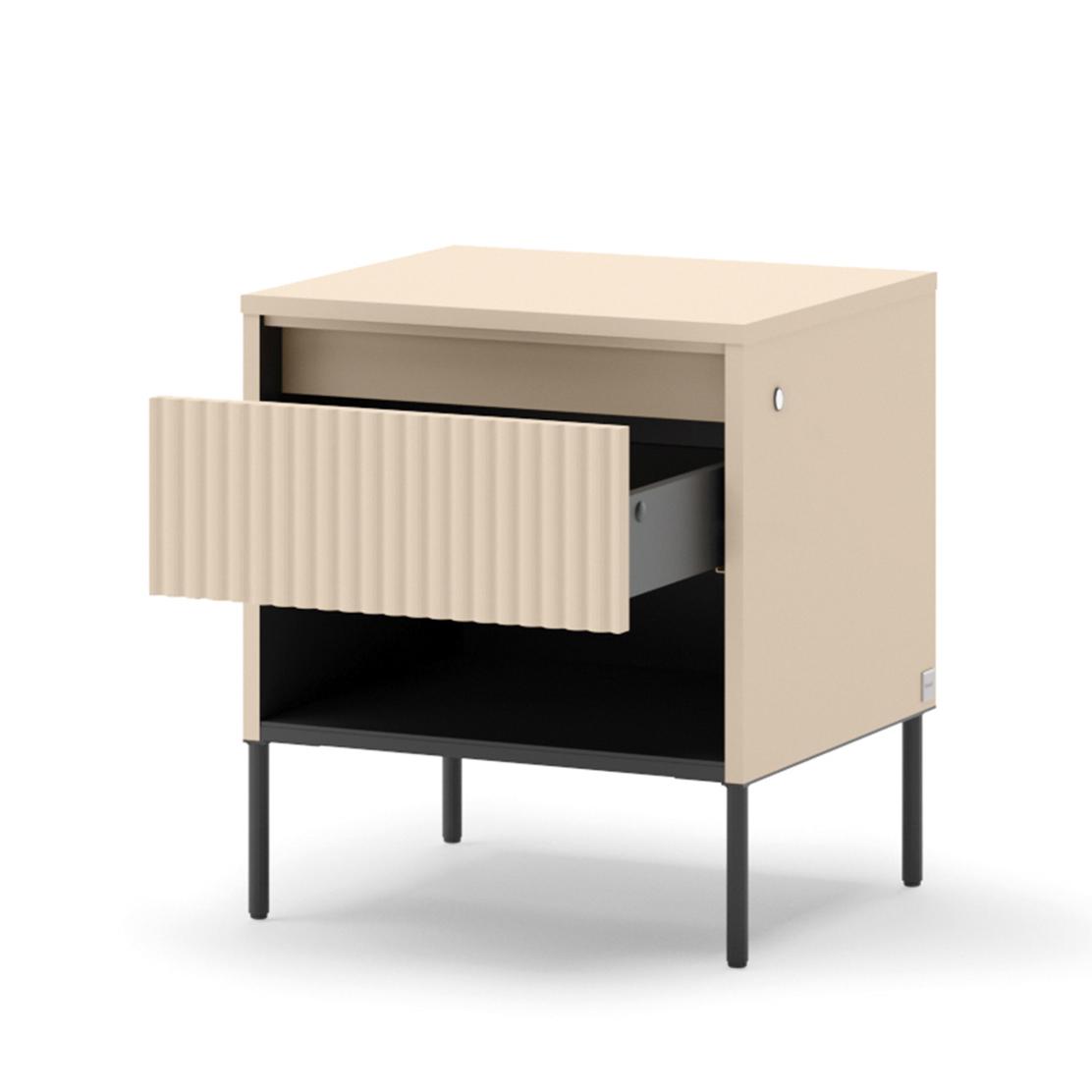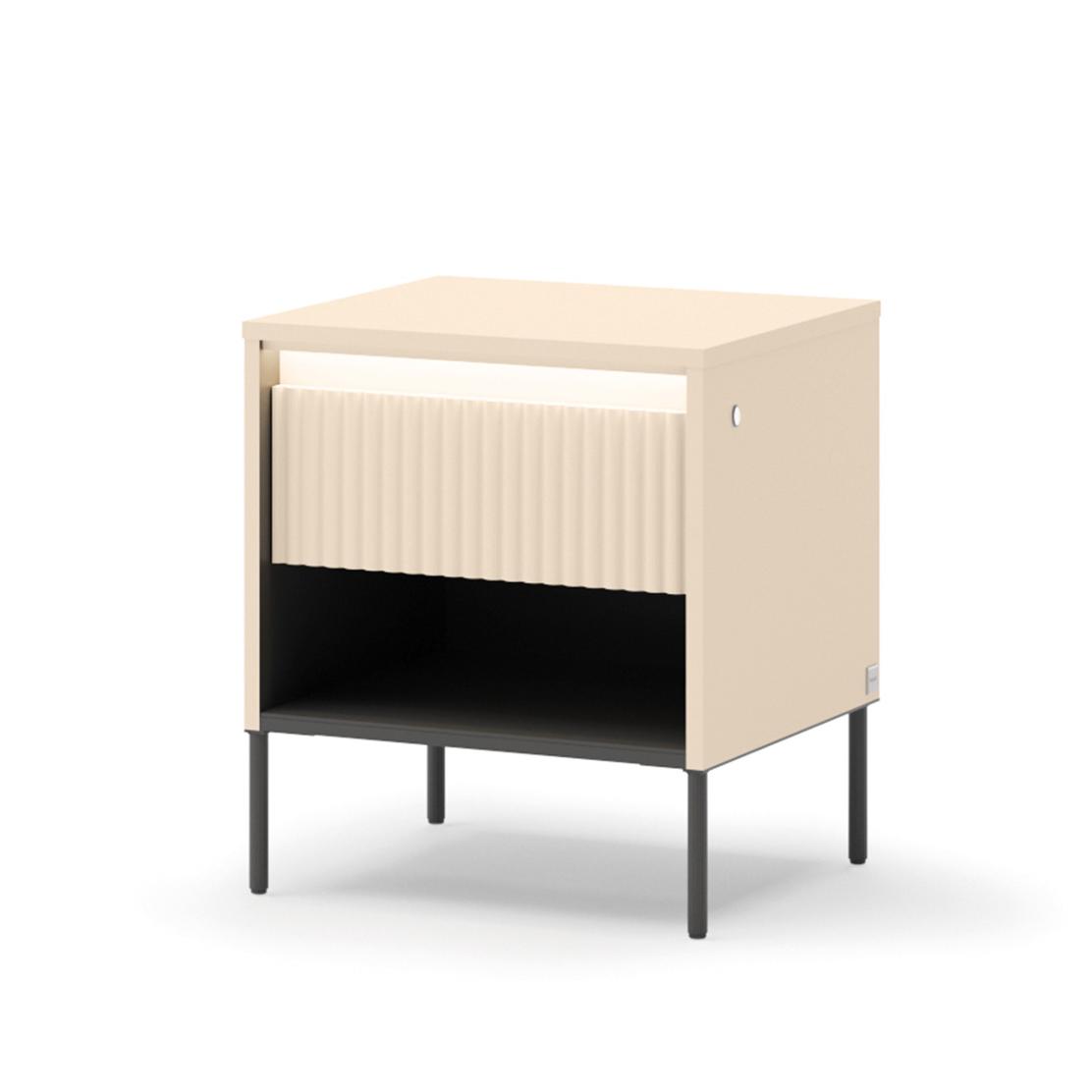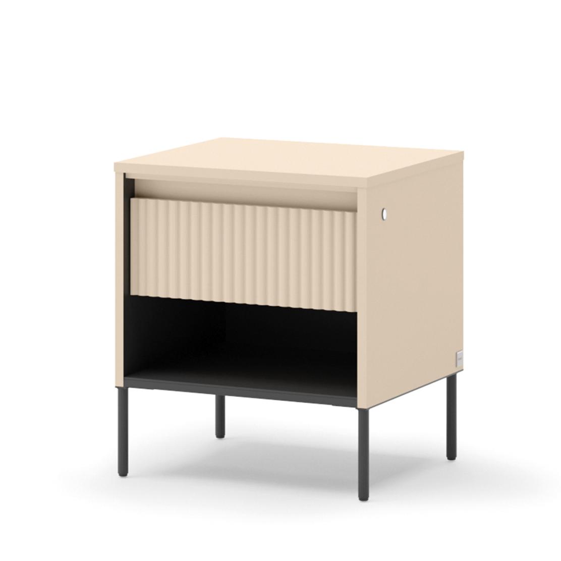 Открийте нощно шкафче TREND, което съчетава модерен дизайн и функционалност, за да трансформира вашата спалня в оазис на комфорт. Елегантното пясъчно бежово и уникалната оребрена повърхност на чекмеджето добавят изискан акцент, създавайки спокойна и вдъхновяваща атмосфера.