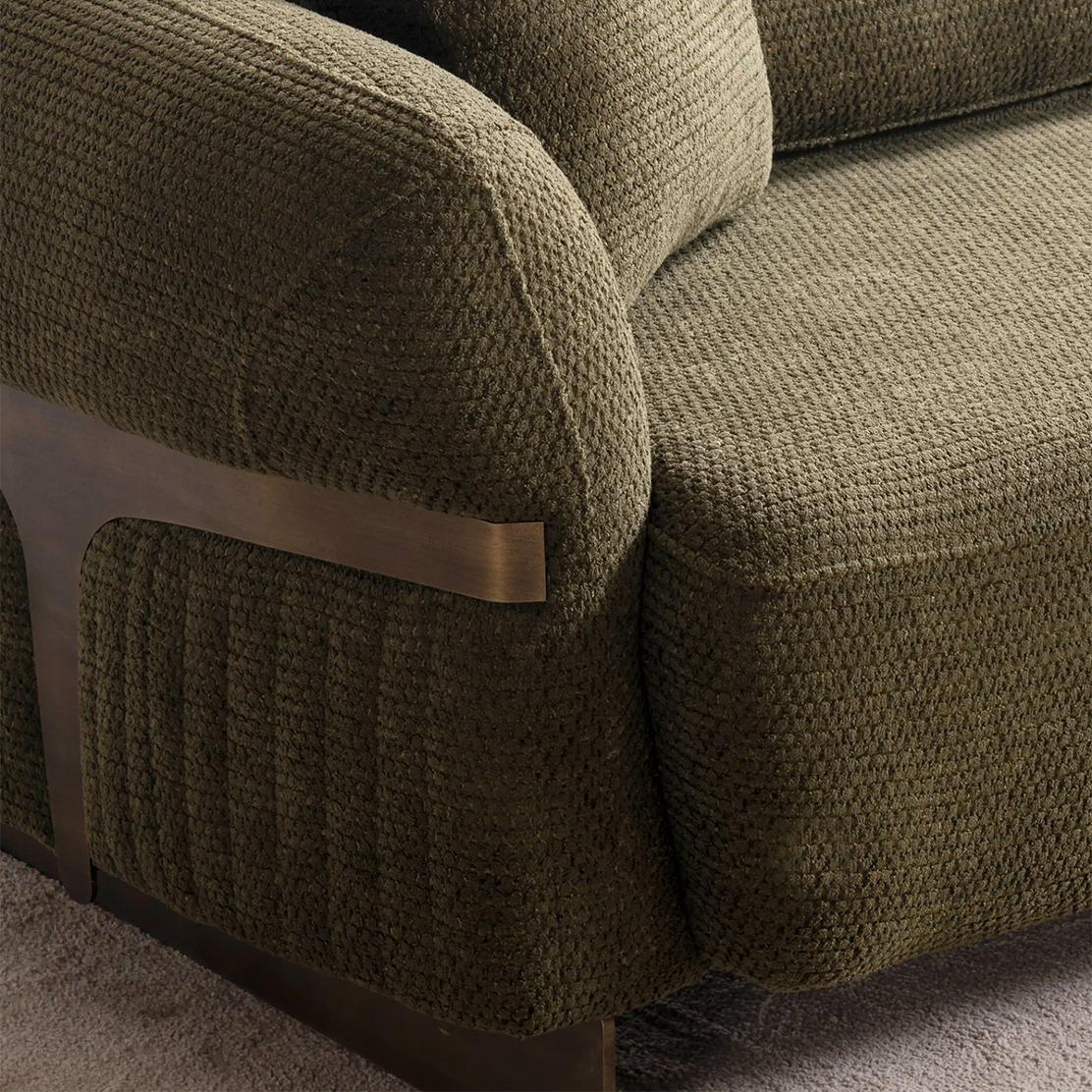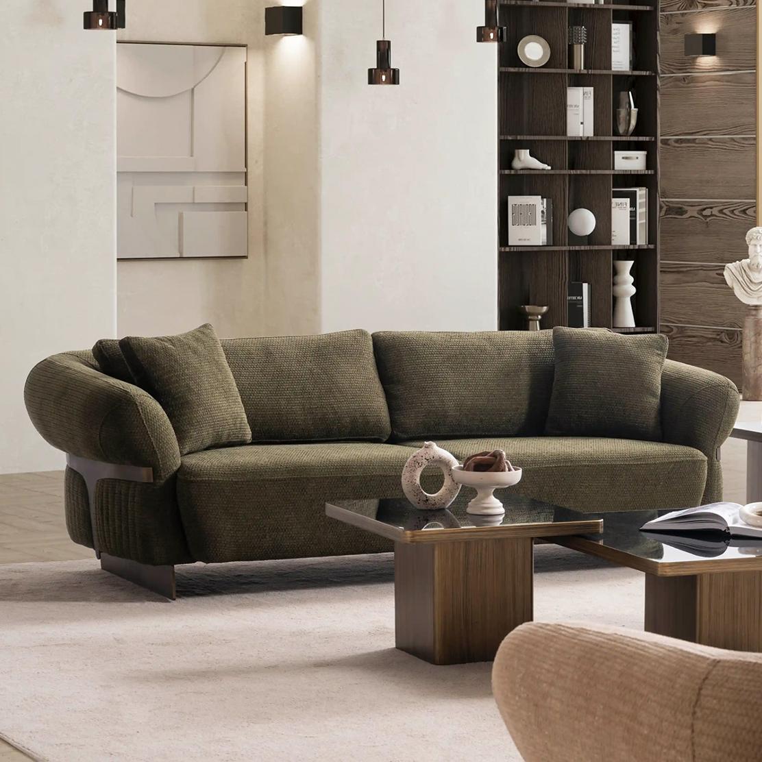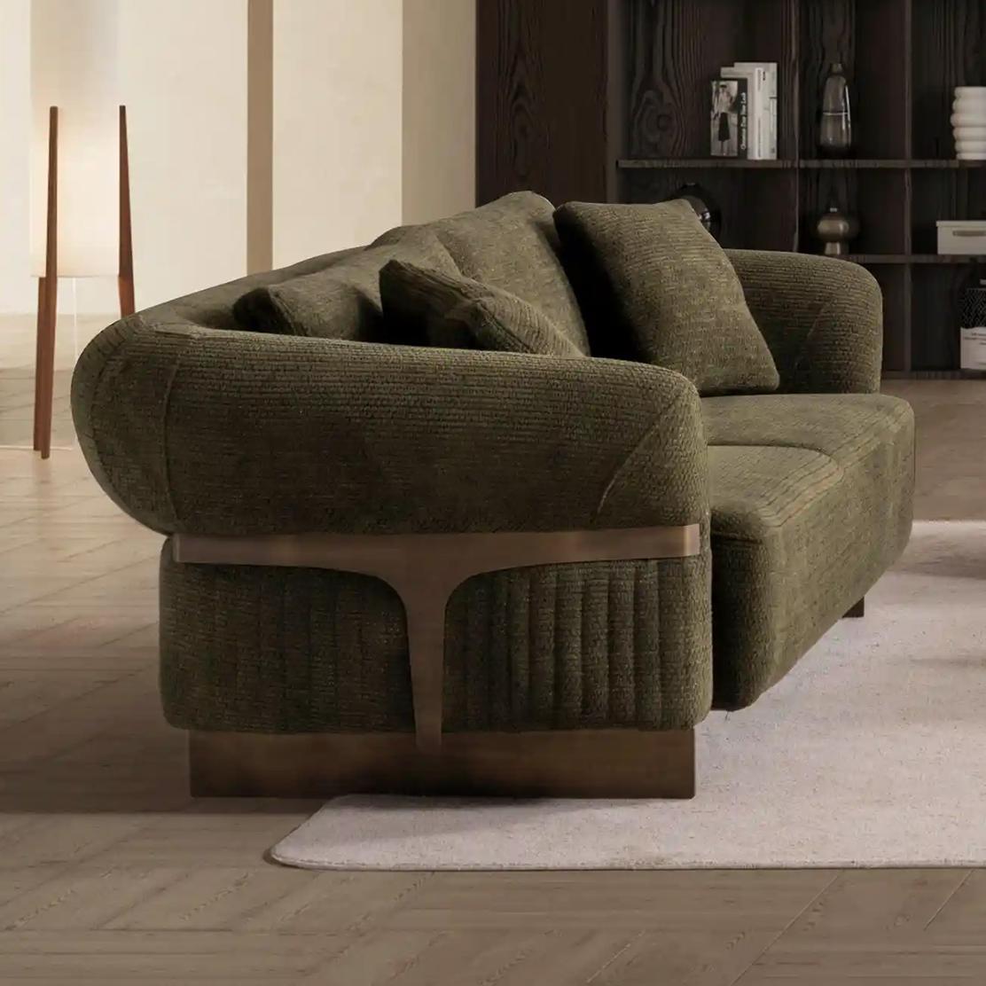 Триместен диван - идеален избор за тези, които търсят комфорт и стил в едно. Ластичните колани и дунапренът в седалката осигуряват поддържаща, но в същото време мека повърхност, която гарантира комфорт. Металната рамка в цвят опушено злато добавя стабилност и издръжливост, а декоративните елементи, изработени ръчно, придават уникален и изискан вид на дивана.