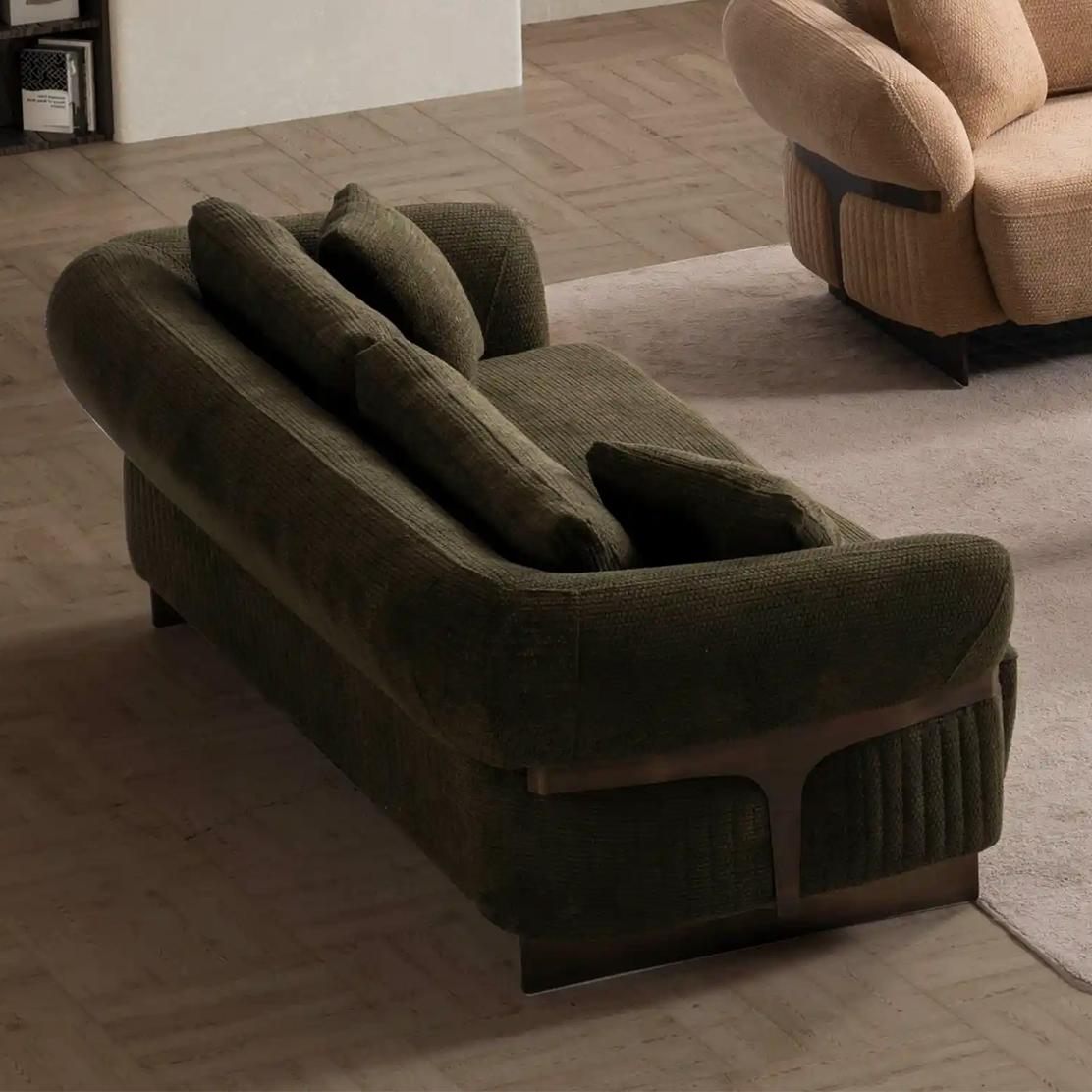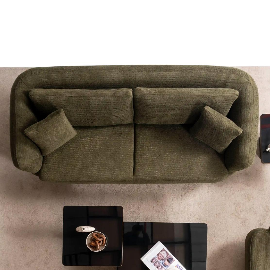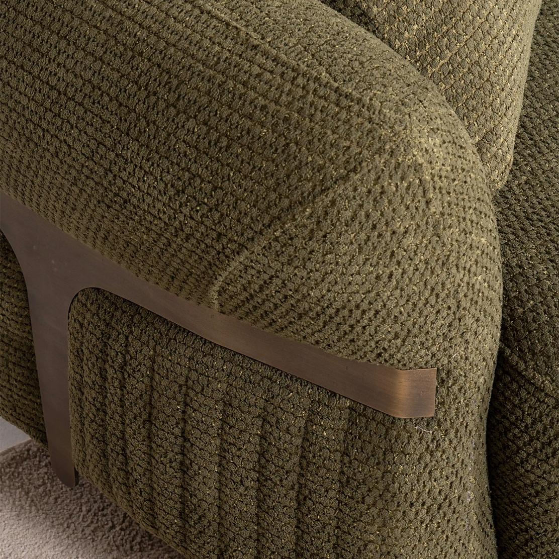 Триместен диван - идеален избор за тези, които търсят комфорт и стил в едно. Ластичните колани и дунапренът в седалката осигуряват поддържаща, но в същото време мека повърхност, която гарантира комфорт. Металната рамка в цвят опушено злато добавя стабилност и издръжливост, а декоративните елементи, изработени ръчно, придават уникален и изискан вид на дивана.