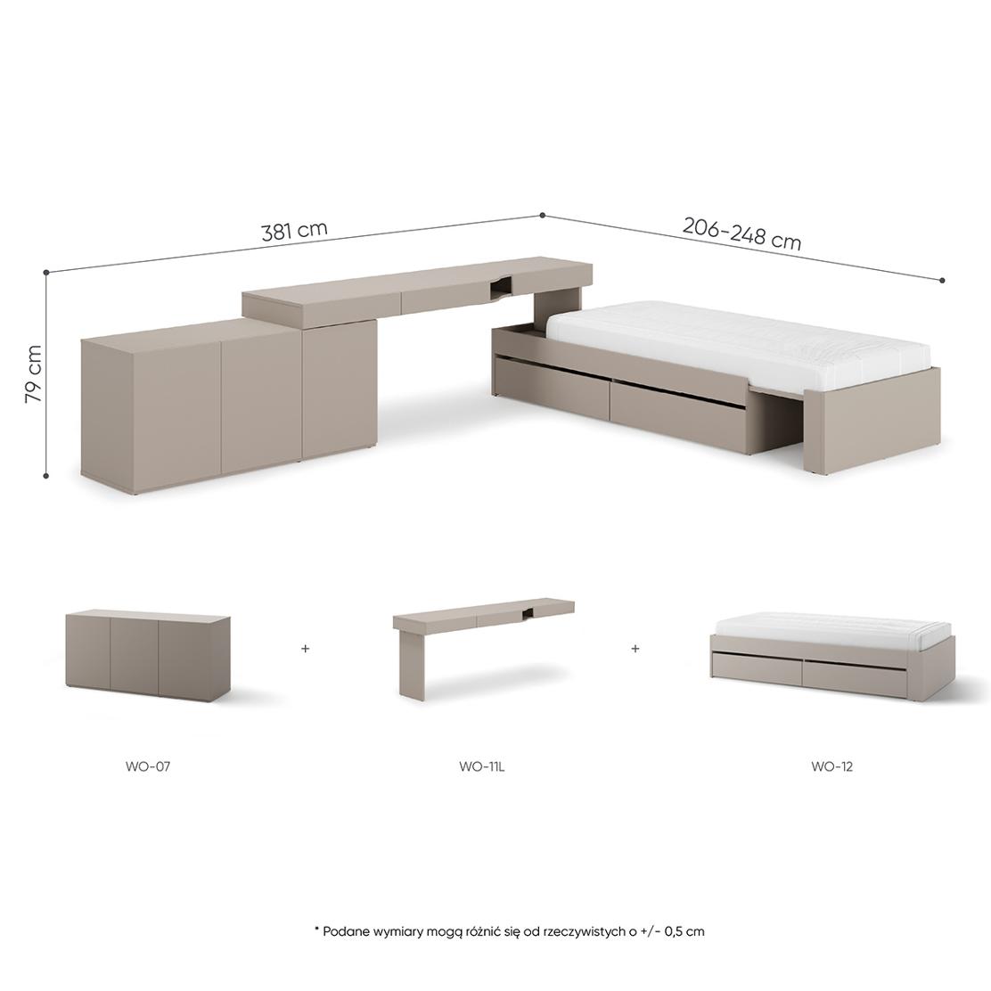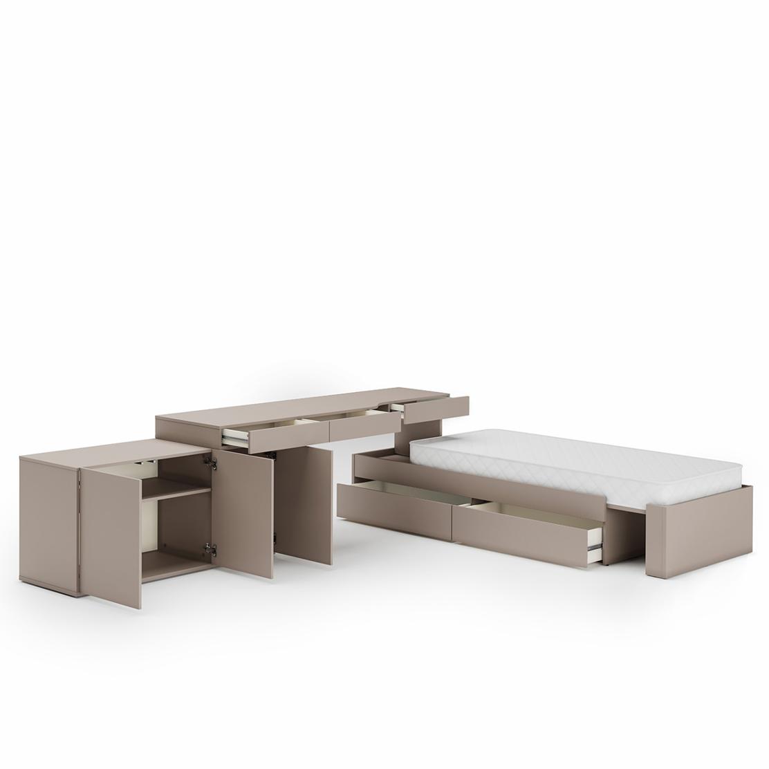 • Функции: Подматрачни чекмеджета на леглото, място за съхранение в шкафа и бюрото.