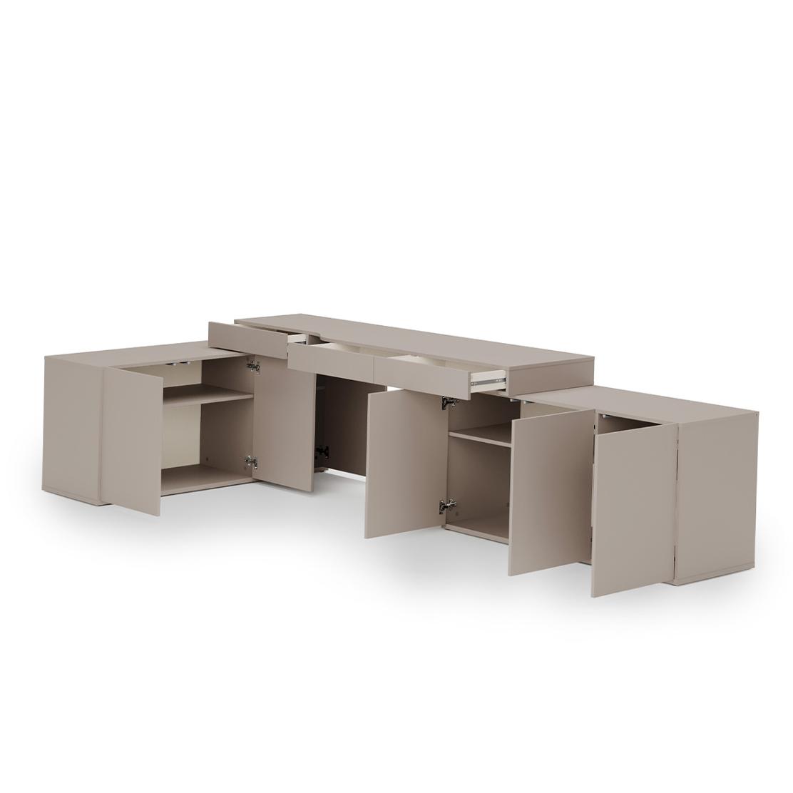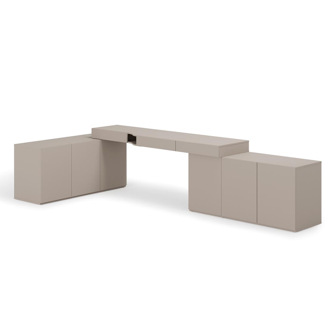 Модулен комплект WOOW: Бюро и шкафове в сива глина – идеално решение за домашен офис или дневна.
