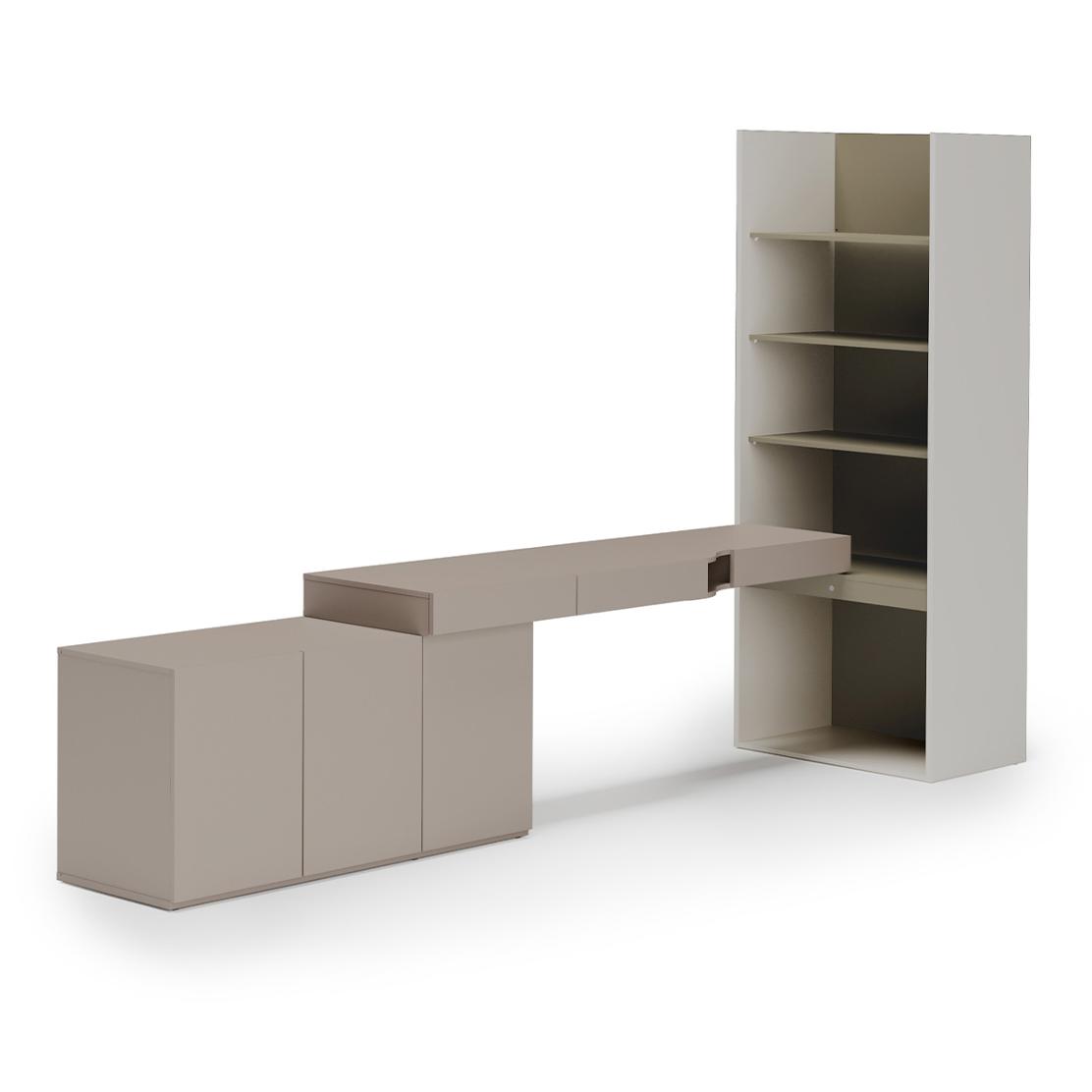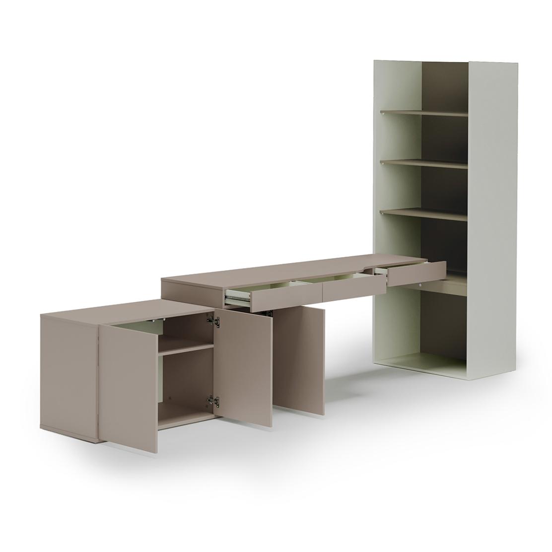 • Оптимална организация с шкаф с три врати, просторно бюро и отворена етажерка.