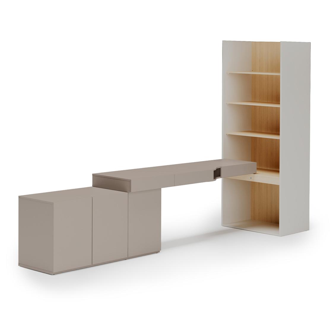 • Оптимална организация с шкаф с три врати, просторно бюро и отворена етажерка.