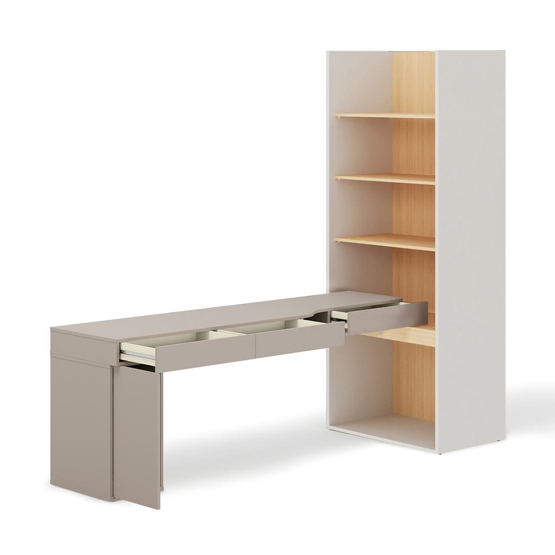 Комплект WOOW: Компактно бюро с етажерка в сива глина и Винченца светъл дъб – идеално за модерен дом.