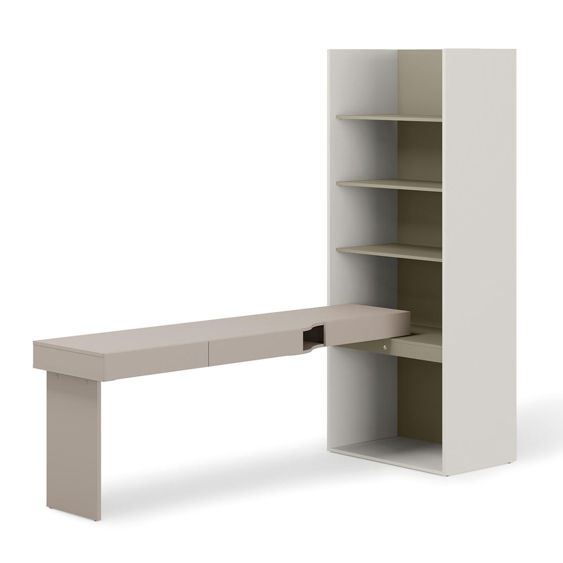 • Цветове: Сива глина (бюро, вътрешни рафтове), Евкалипт (корпус на етажерката)