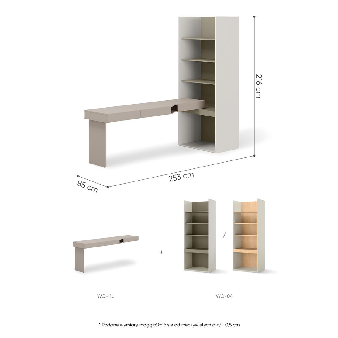 Бюрото осигурява гъвкавост, позволявайки ви лесно да трансформирате зоната си за работа или учене. Снабден с практични чекмеджета и достатъчно място за съхранение на рафтовете, WOOW е създаден да оптимизира пространството, без да прави компромис с функционалността или естетиката.